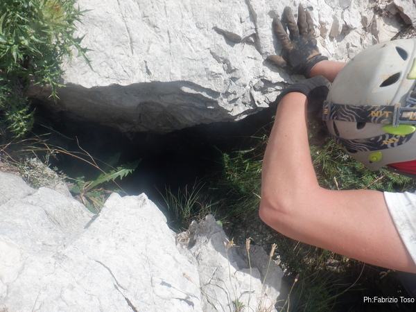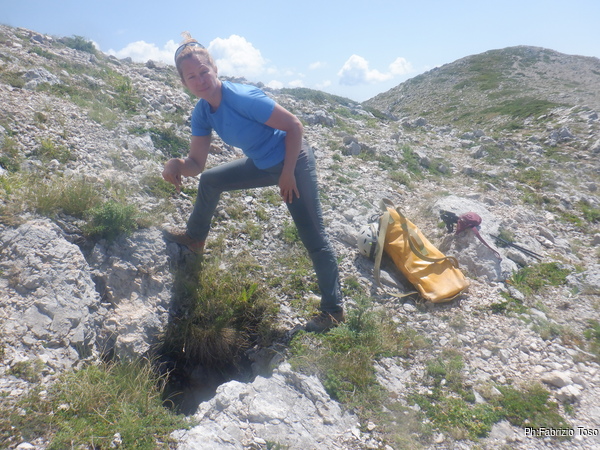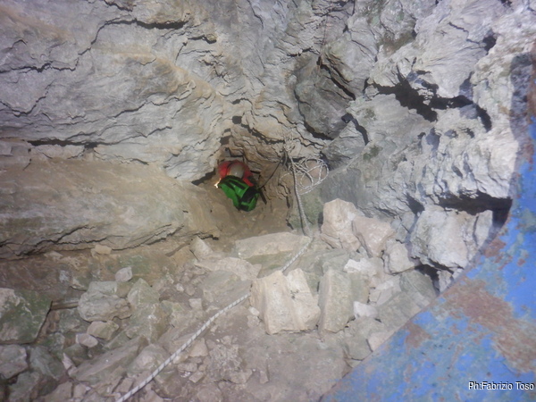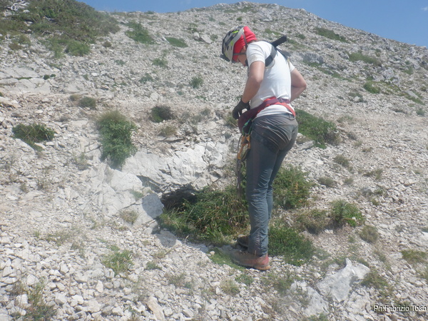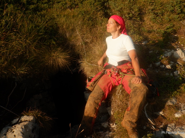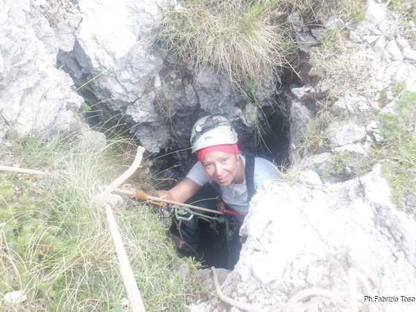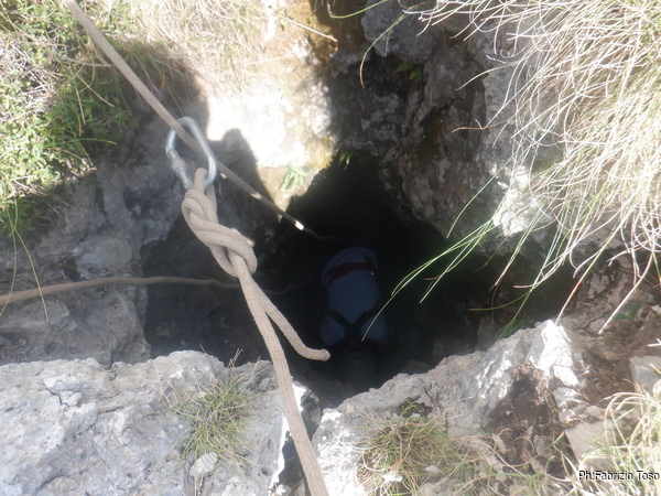 Le faccio sicura per il primo tratto fino a che raggiunge l’attacco e sistema la corda. Scende un poco, potrebbe scendere ancora ma il cunicolo si stringe. Le passo la fotocamera per documentare l’interno ma lo spazio e’ esiguo e non si capisce molto. Pero’ alla fine questa sembra essere la piu’ promettente del trio odierno.