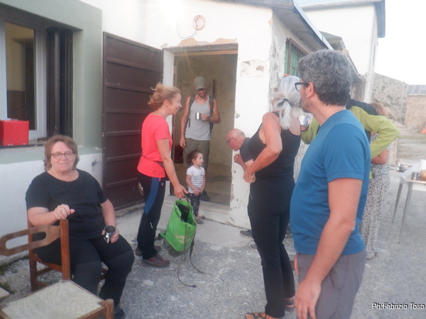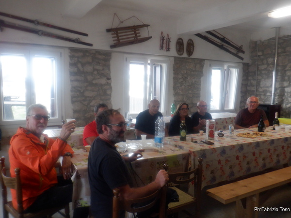Arriviamo al rifugio che ora sembra deserto. Quasi tutti i convenuti sono oramai partiti o sono in procinto di farlo. Solo nella sala comune troviamo un po’ di amici ancora a tavola a condire con qualche chiacchiera uno spuntino aperitivo. Con la fame e la sete che ho non mi faccio pregare e approfitto mischiando pezzi di torta a bocconi di formaggio col pane e un paio di bicchieri di vino. Mentre ci rifocilliamo ci aggiorniamo reciprocamente sugli accadimenti odierni e qualche primo commento sulla bella riuscita di questo campo.