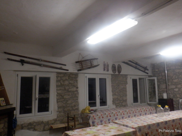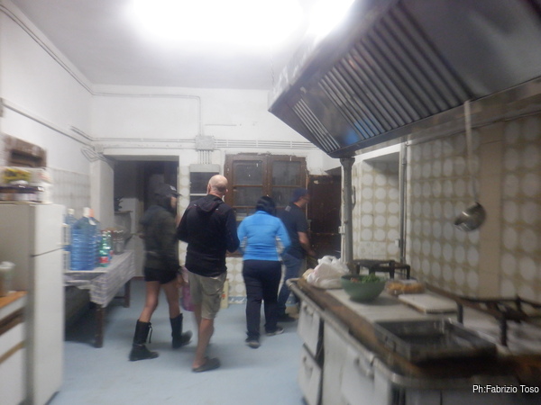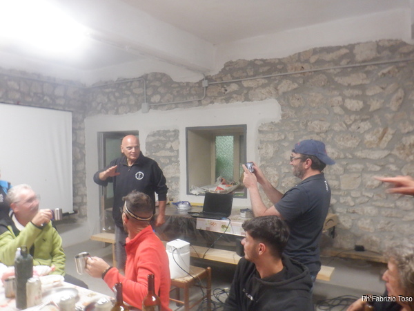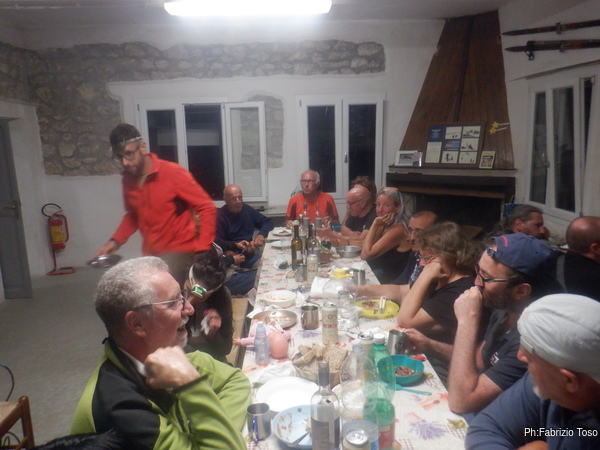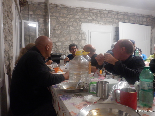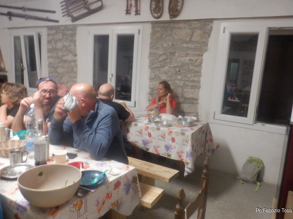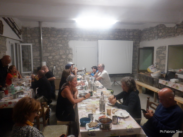 Con il ritorno delle varie squadre dalle grotte e luoghi visitati oggi il rifugio si anima di speleo affamati di cibo e di notizie. Si formano e si disfano capannelli spontanei dove circolano le informazioni su quanto fatto oggi. Ma quando si viene chiamati per la cena ci precipitiamo in blocco nella sala comune.