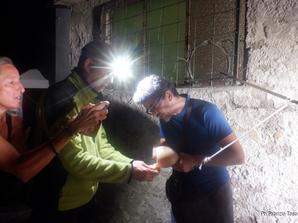 Fuori intanto Giuseppe si e’ nominato officiante al caciocavallo impiccato e distribuisce questa delizia paradisiaca man mano che il fuoco fa il suo dovere rendendo il caciocavallo caldo e filante.