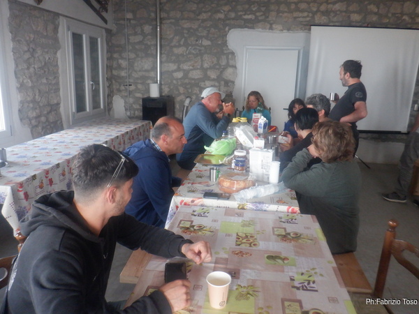 Intanto nella sala comune del rifugio si inizia a mangiare qualcosa di antipasto. Ho una bella fame, quindi mi approprio subito di pane, formaggio e pomodori in quantita’ sufficiente a placare il mio stomaco. Soddisfatto questo bisogno primario faccio un bel giro di foto per la tavolata.