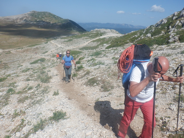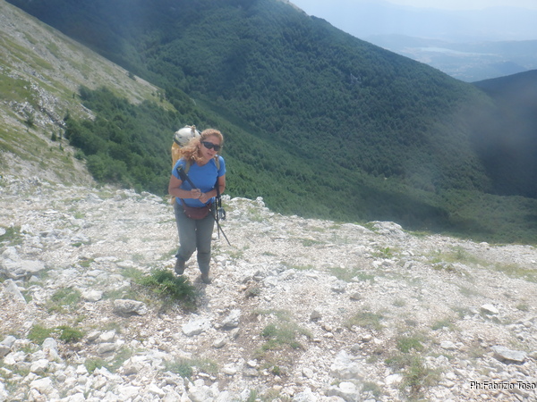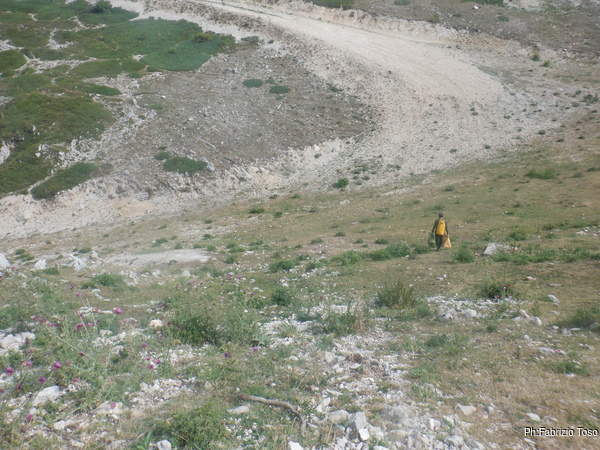 Mi e’ successo raramente perche’ ho sempre avuto un buon senso dell’orientamento ma stavolta succede. Torno indietro ma la grotta non la trovo piu’! Inizio a girare prima lungo il sentiero guardando in basso poi scendo a valle e cammino parallelamente al sentiero guardando in alto, ma della grotta dove Alessia sta lavorando nessuna traccia.