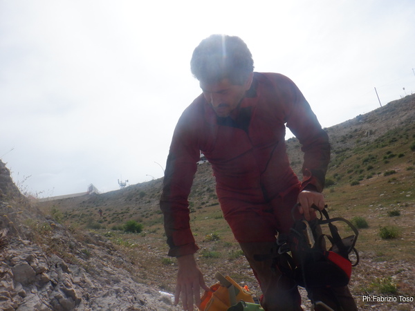 Il momento piu’ difficile della grotta in questo periodo e’ quello in cui si deve portare il generatore fin su alla strada. Per fortuna che Giuseppe e Fabio hanno ancora qualche energia per sopportare egregiamente anche questa fatica.