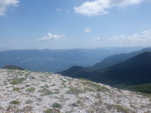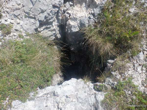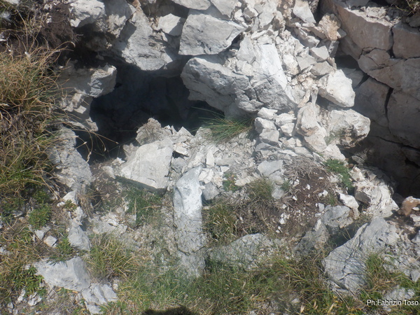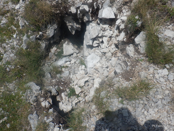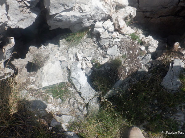 Mi stufo presto di stare senza far nulla quindi avverto Alessia che vado a fare un giro. Sono fortunato perche’ appena tornato sul sentiero che corre in cresta e affacciato dal lato opposto scorgo in lontananza un paio di buchi che sembrano interessanti. Scendo nella valletta sottostante per verificare. Le mie speranze sono deluse. Forse erano grotte ma sono malamente ostruite da massi enormi e non si sente un filo d’aria. Li lascio al loro destino e ritorno verso la “nostra” grotta.