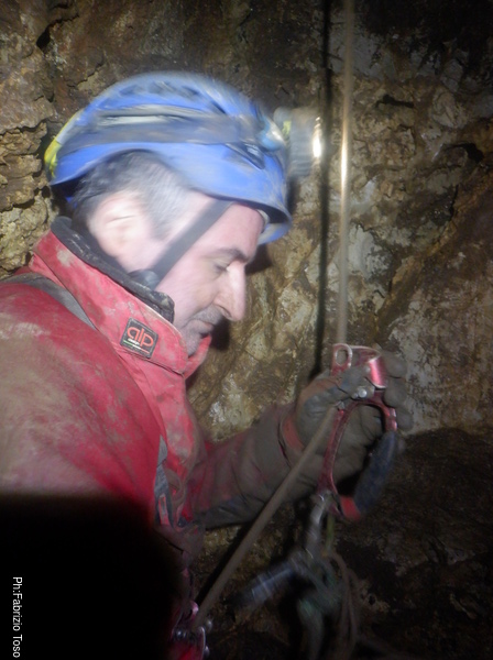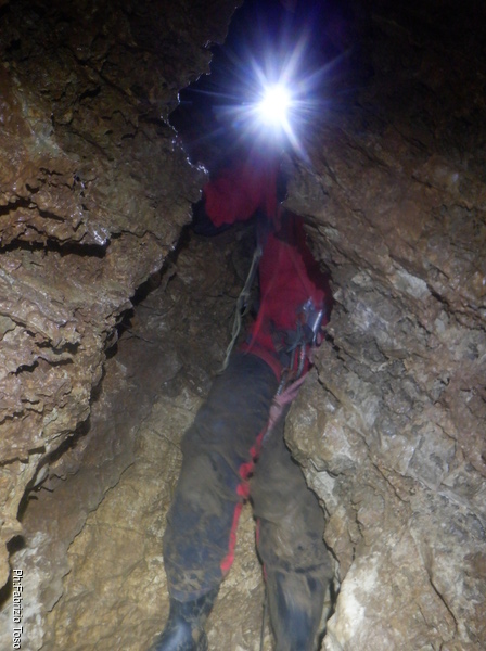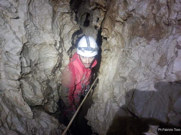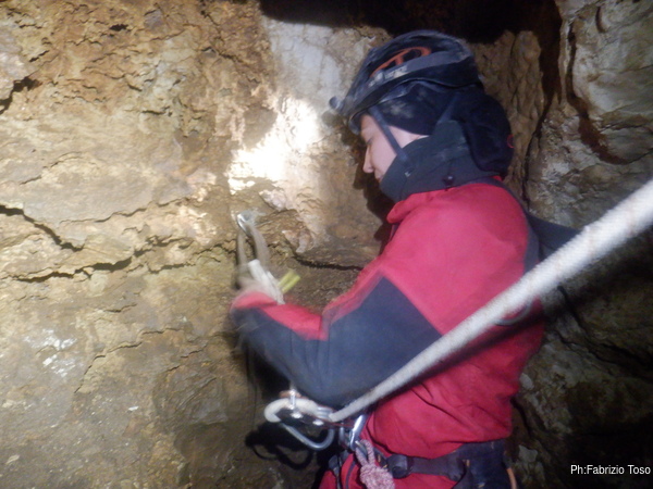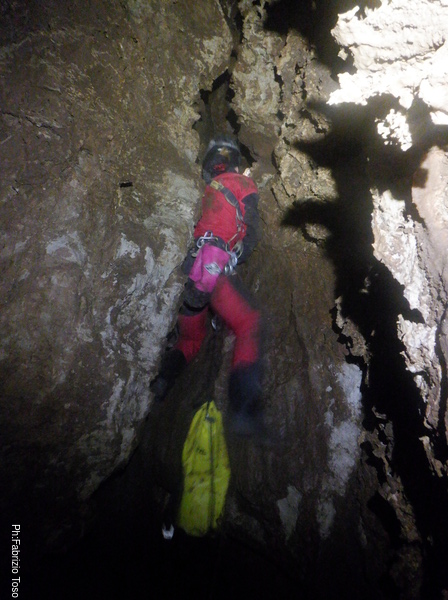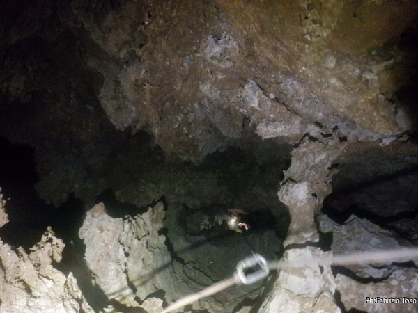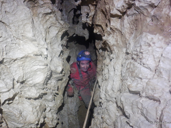 Salgo, gli attacchi sembrano reggere. Arrivato all’ultimo attacco messo mi sistemo e salgo ancora un metro fino a raggiungere una cengia dove saremo comodi per ripartire. Metto un bel fix e sistemo la corda cosi’ che Linda possa salire. Nel frattempo esorto Angelo e Francesco ad andare a vedere il fondo della diramazione e poi a tentare la risalita in libera poco piu’ avanti a dove siamo noi.
