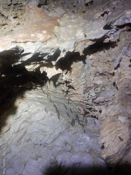 Da bravo “padrone di casa” scendo per primo spiegando a Linda, che mi segue, come affrontare al meglio il pozzo. Mentre aspetto che mi raggiunga faccio una foto ai numerosi “zanzaroni” ammucchiati sulla parete della sala.