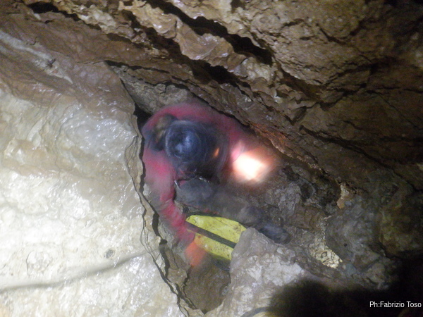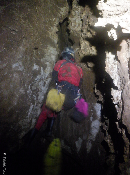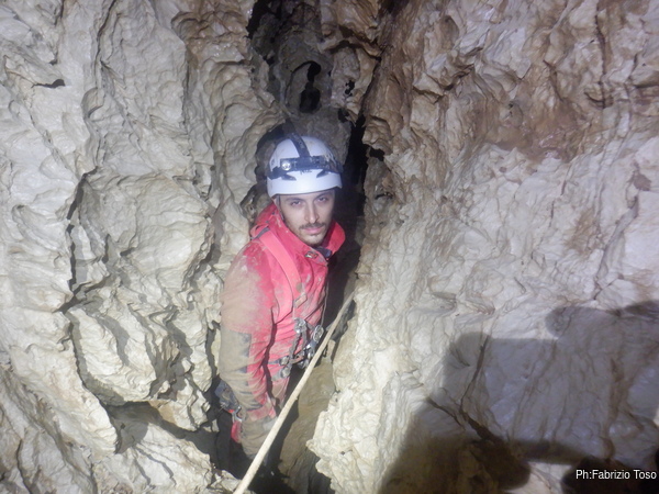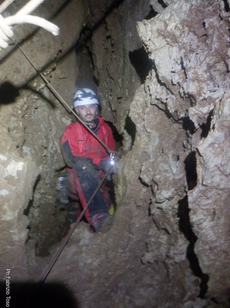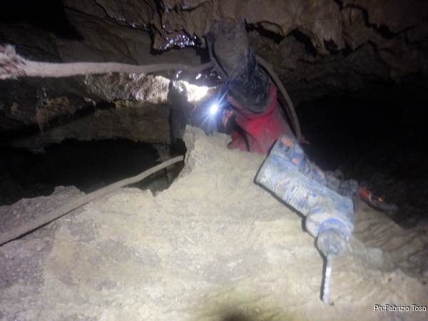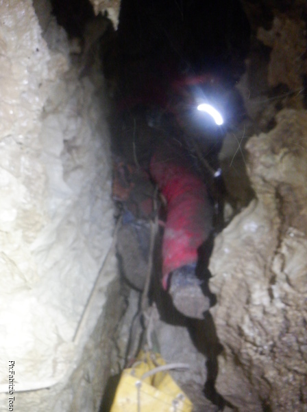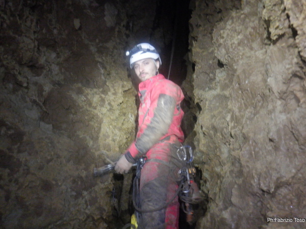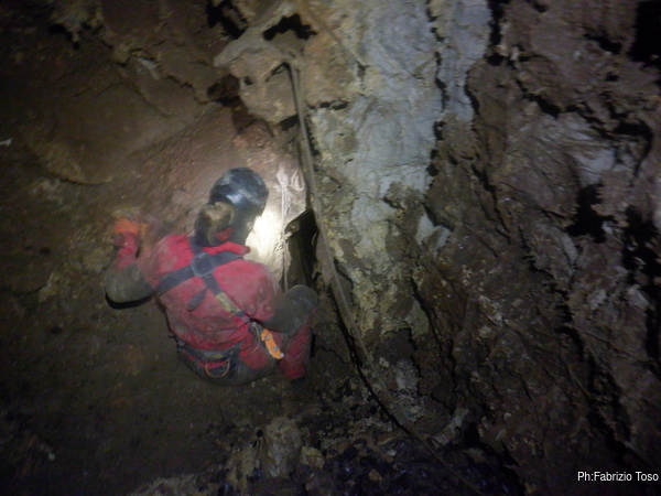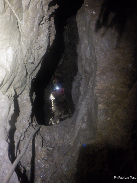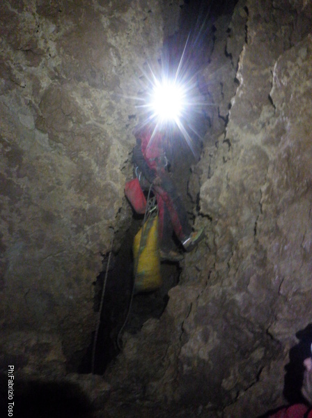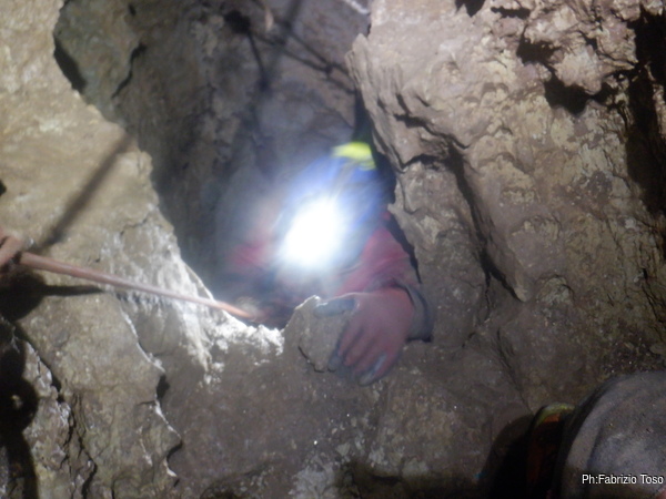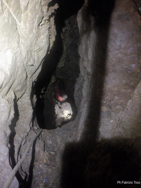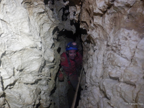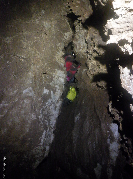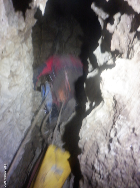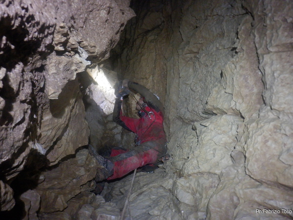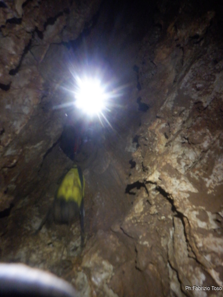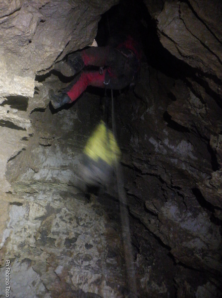 Trovo un posto comodo dove incastrarmi e butto giu’ alcuni sassi cercando di non uccidere Francesco che e’ quasi sotto di me. Tolti di mezzo i sassi pericolanti mi guardo intorno e intanto pianto un fix e sistemo ancora un attacco per mettermi in sicurezza. Una volta allongiato finalmente posso tentare delle foto a quel che vedo. La frattura che stiamo seguendo sembra proseguire leggermente in salita con punti in cui si intuiscono pozzi che magari si ricollegano con la sottostante diramazione, magari anche con la risalita in libera appena fatta da Angelo.