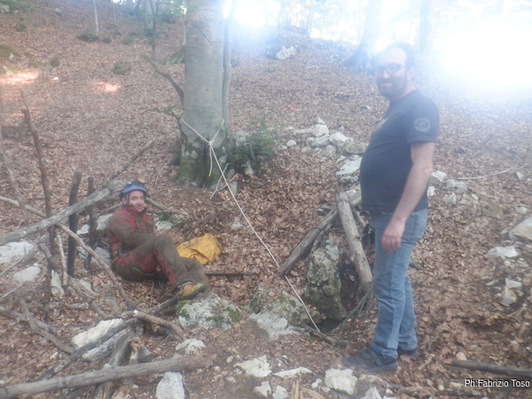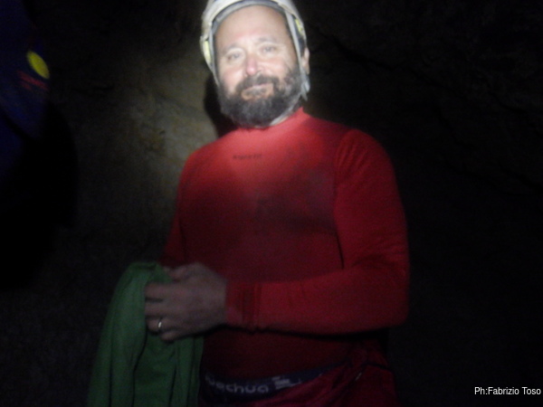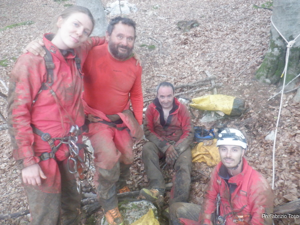 Cercando di non fare troppi danni muovendomi e lanciando sassi ai miei compagni sotto di me, entro nel buco e piazzo un secondo fix per chiudere il traverso, mi metto in sicurezza e guardo in alto. Sulla mia testa sembra proprio ci sia un nuovo fuso! La parete è alta almeno una quindicina di metri e sopra sembra proprio che continui, urlo subito a Bibbo di raggiungermi. Arriva Bibbo e anche lui vede quello che vedo io. Non so cosa abbia provato esattamente perché non saprei riconoscere ancora quando una nuova strada sembra essere promettente, ma intravedo il suo sorriso e capisco che proprio male non è! Ci facciamo raggiungere dai nostri due compagni e cedo il posto ad Angelo per continuare la risalita. Angelo parte e piazza altri due fix sopra di noi salendo di altri cinque o sei metri e ci conferma anche lui che la risalita continua per un bel po’. A quel punto è quasi ora di andare via, c’è Gabriele che ci aspetta fuori e non vorremmo farlo preoccupare. Bibbo sale a dare un’ultima occhiata, la risalita sembra continuare sia verso destra che verso sinistra, ma avremo bisogno di un’altra giornata almeno per continuarla. Ci giriamo tutti abbastanza soddisfatti e ripercorriamo il percorso al contrario. Questa volta abbiamo meno materiale ma gli ultimi tre saltini prima dell’uscita non sono meno scomodi. Usciamo tutti fuori e raggiungiamo Gabriele che ci stava aspettando. Era poco fiducioso anche lui e invece gli raccontiamo che la risalita sembra proprio essere promettente. Ci cambiamo e ci avviamo verso delle meritatissime fettuccine al ragù. Finisce cosi la mia prima giornata esplorativa, torno a casa con soddisfazione, chiedendomi se sia possibile che cosi alla prima botta si possa aver trovato veramente qualcosa di promettente. Avremo bisogno di un’altra uscita per scoprirlo.