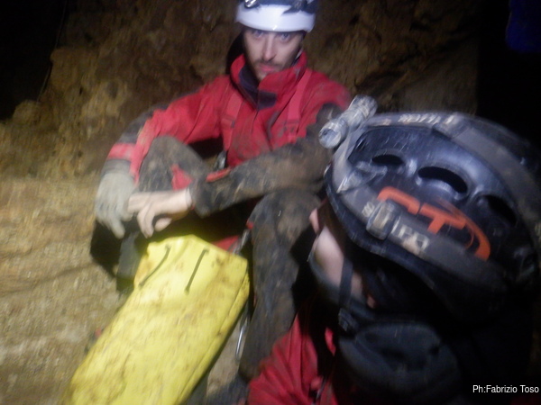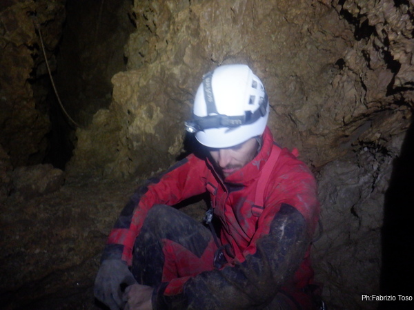 Una volta su, urlo a Francesco che pu’ uscire e mi metto seduto davanti all’imbocco del P10 per parare almeno in parte quello che Francesco tirera’ giu’ tra poco.