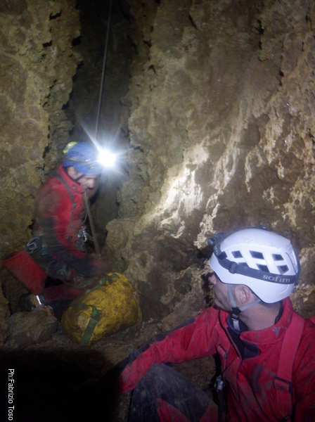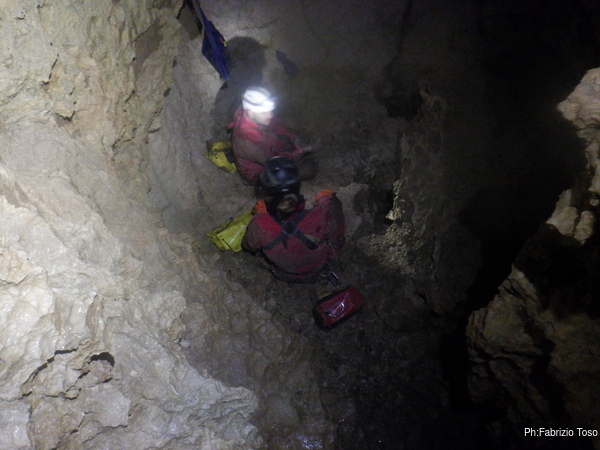 Una volta che siamo tutti riuniti racconto ai miei amici come si sviluppa la grotta descrivendo brevemente il secondo P50, commento che in effetti si tratta di un P100 con un’ampia cengia in mezzo, quella dove siamo noi. Racconto loro della prima risalita fatta qua sopra, fino al fuso da dove arriva l’acqua che tiene fresche le stalattiti di fango. Passo poi alla seconda risalita, quella fatta con Elisa dove ci rendemmo conto della presenza di alcuni ambienti subito dopo. Per finire racconto dello scavo del cunicolo che porta alla diramazione laterale dove andremo a proseguire la terza risalita.