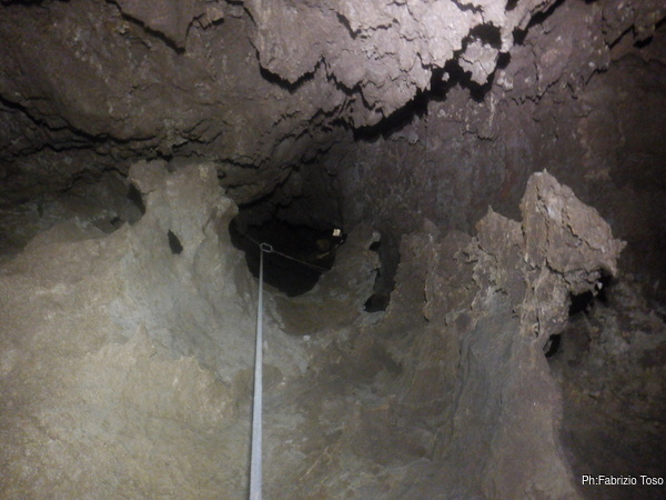 Racconto anche di una piccola risalita fatta in libera che vorrei che Angelo tentasse a sua volta. Per ultima mostro loro la corda “muffosa” della risalita che oggi proseguiremo. Le condizione della corda e il fatto che avessi usato dei multimonti da 6mm non ispirano molta fiducia, quindi decido che il primo tratto lo risaliro’ io per poi sistemare l’armo e far proseguire i miei baldi esploratori.