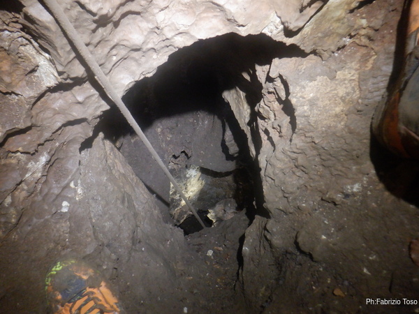 Dopo il P10 andiamo decisi al P25. Anche qua faccio da cicerone ai miei amici raccontando il lungo lavoro fatto per rendere praticabile il passaggio. Spiego loro anche come e’ meglio passare la (ex)strettoia che porta al pozzo vero e proprio.