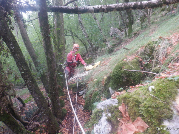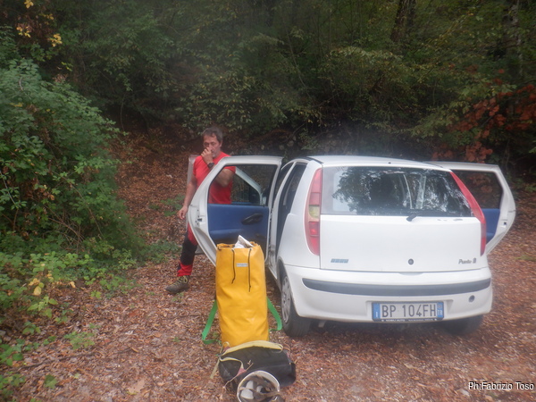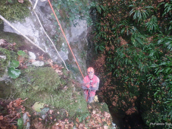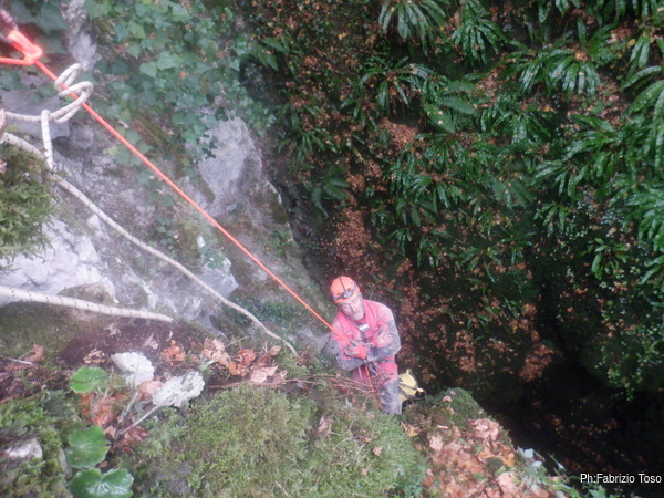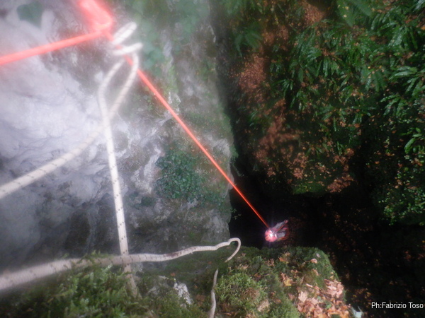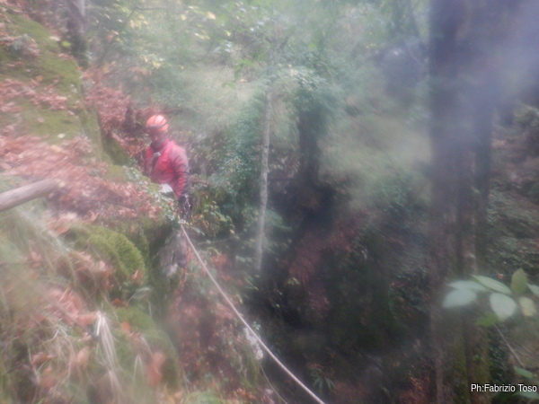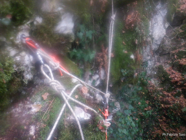 Armo il traverso e do anche una ripulita sul camminamento togliendo una grossa radice marcia e ricoperta di muschio. La partenza della discesa non presenta problemi, ci sono giusto 2 fix dal bell’aspetto e li utilizzo. I guai vengono dopo, nel cercare un armo che vada sulla verticale. Dopo una lunga ricerca col martello con le rocce intorno a me che suonano “fesso”, trovo un angolino che sembra buono e lo uso. Il secondo attacco sara’ l’albero a “L”, quello solito. Ho voluto doppiare l’albero perche’ Giuseppe lo ha visto muoversi eccessivamente, meglio non rischiare.