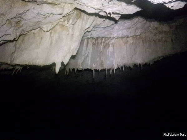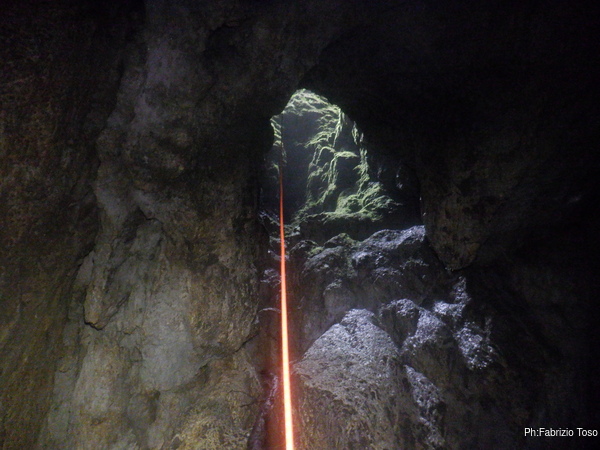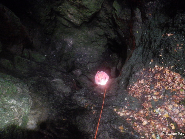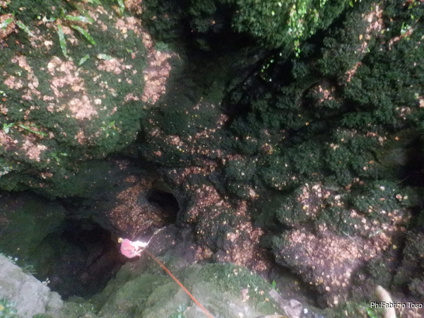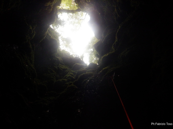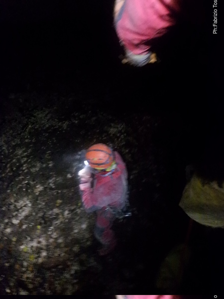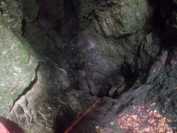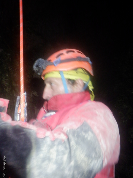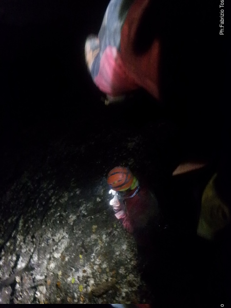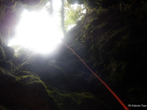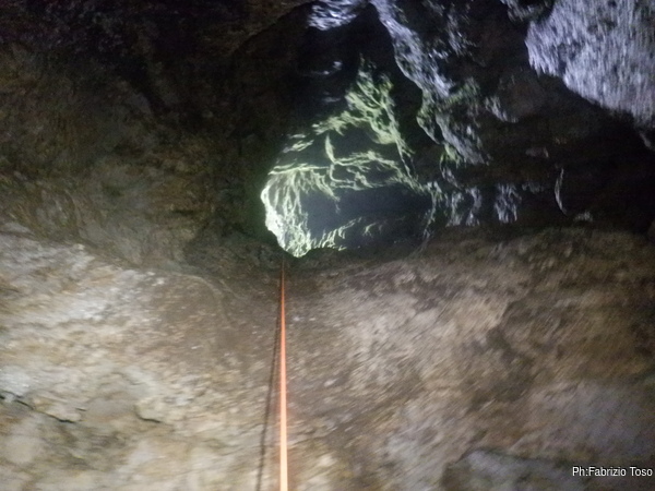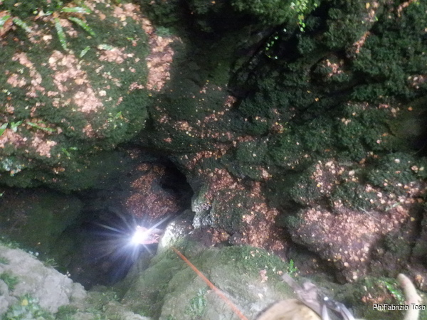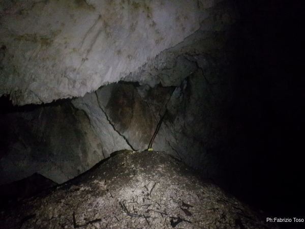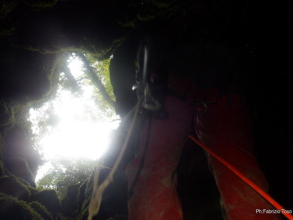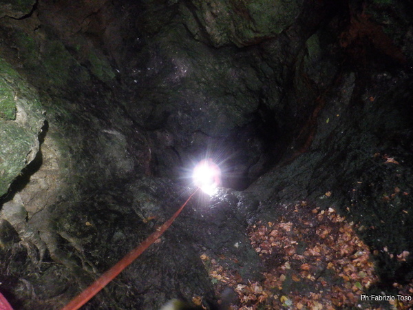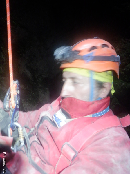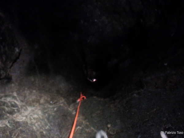 Dopo aver sistemato il frazionamento, Giuseppe prosegue con la discesa. Arrivato quasi in fondo pero’ mi urla che ha il dubbio che la corda non arrivi in fondo al pozzo. Continua la discesa per andare a verificare. Qualche secondo e sembra arrivare a toccare terra. Arriva a malapena, ma arriva. Parto per raggiungerlo lasciando tutta la roba pesante agganciata ai moschettoni dell’armo. Arrivato al frazionamento sotto, per sicurezza recupero qualche centimetro di corda e poi proseguo la discesa.