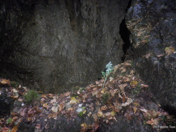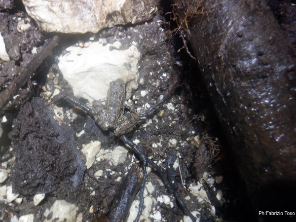 Io inizio a sentire freddo, posso scegliere tra cambiare maglia o iniziare a risalire. Scelgo la seconda opzione e inizio a risalire il cono detritico. A meta’ incontro un ranocchio…sara’ mica quello di Grotta Scura che mi ha magicamente seguito?!? Non faccio a tempo a chiederglielo che quello salta via sdegnosamente e scompare in un buchetto. Lo lascio in pace.