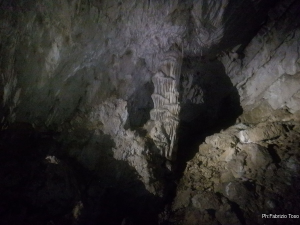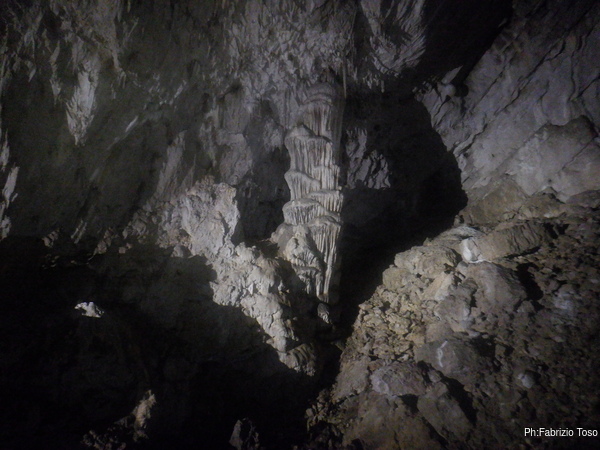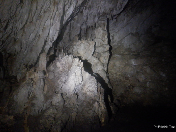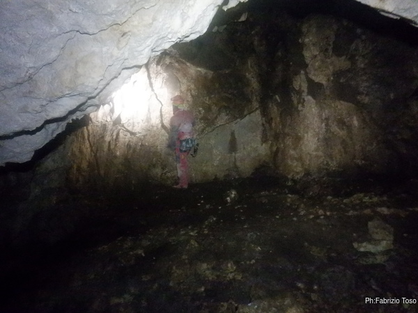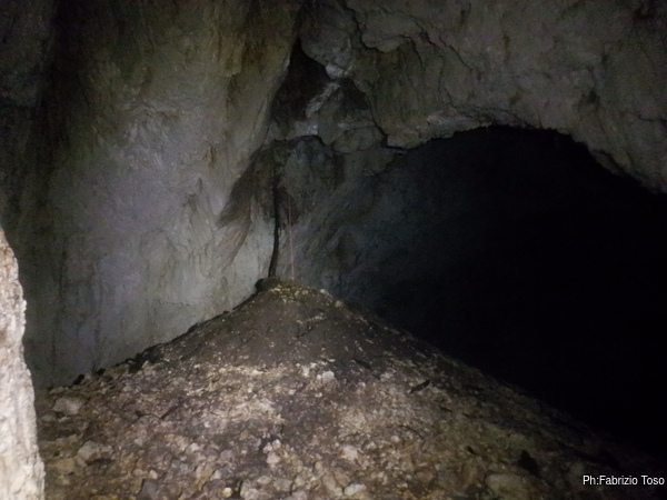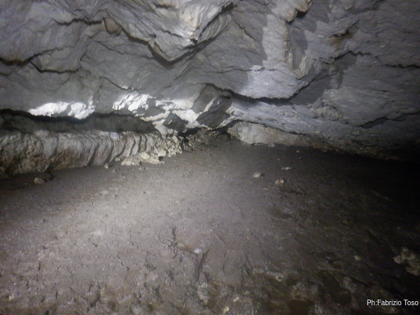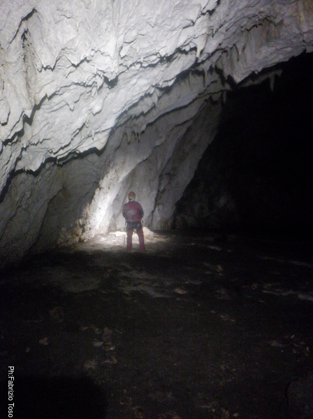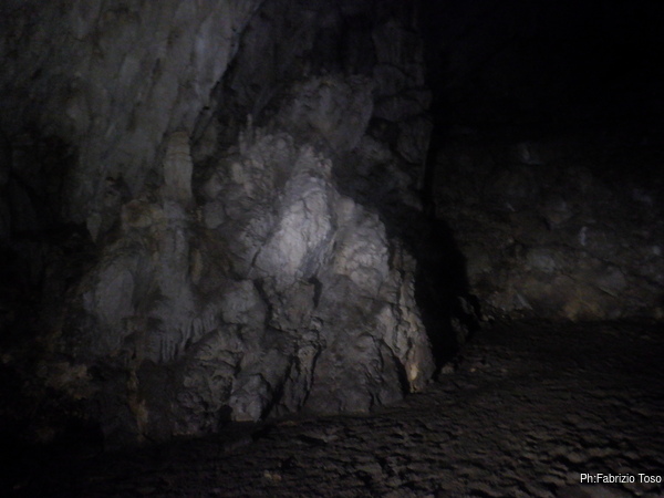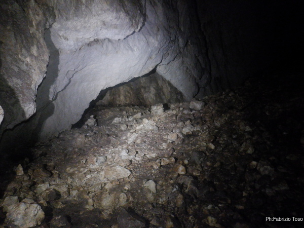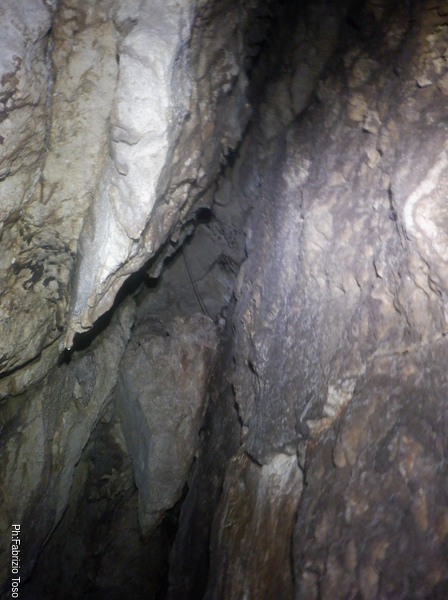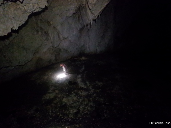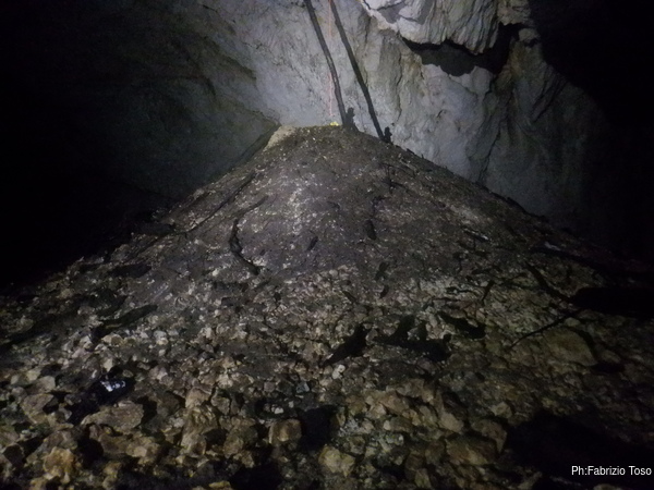 Arrivo a terra e scendo l’imponente cono detritico per arrivare alla base della sala. Vado a dare uno sguardo alla nicchia dove dovrebbe arrivare la seconda diramazione del pozzo. Di solito qua, quando e’ periodo, si possono incontrare centinaia di pipistrelli. O almeno era cosi’ una decina d’anni fa, ora non se ne vede traccia, se non per lo spesso strato di guano per terra..