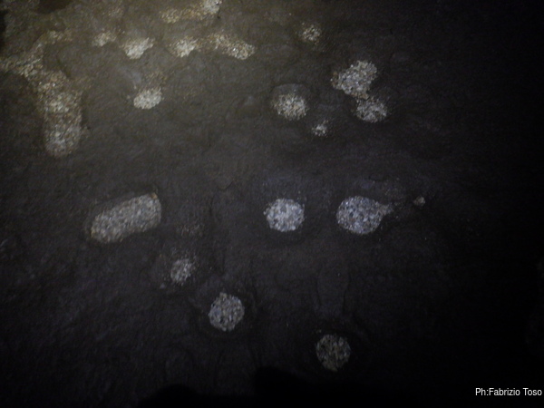 Fango lavato via dallo stillicidio rivelando le pietre sotto.