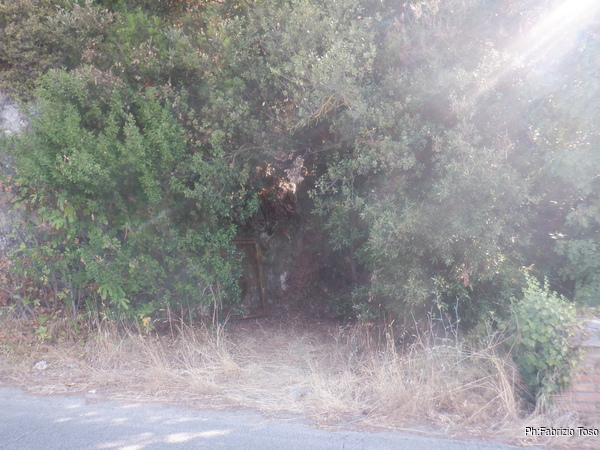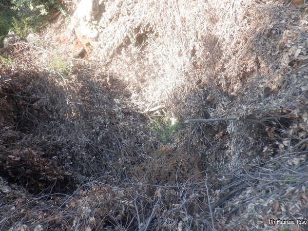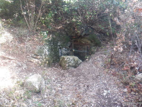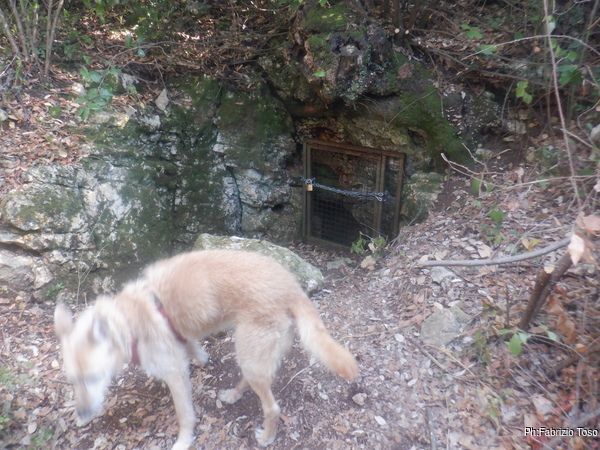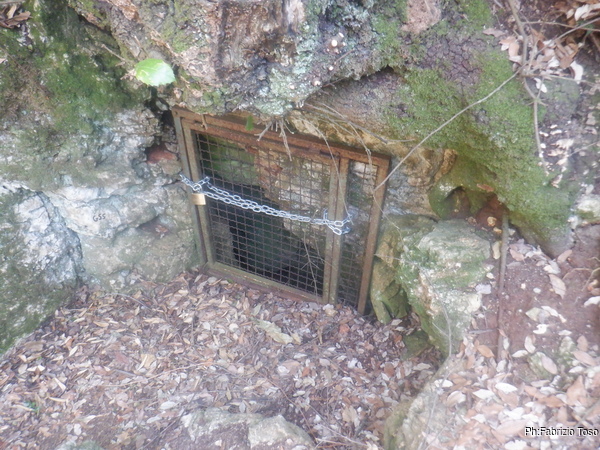 Meno male che i miei amici la volta scorsa hanno fatto un superbo lavoro per aprire un sentiero che portasse alla grotta. Pochi metri e ci sono. Anche qua, a parte l’angolo di roccia con l’ingresso alla grotta non c’e’ piu’ traccia del bosco che ricordavo. Ora e’ tutto un intrico di rami e spini. L’ingresso e’ sempre chiuso da una grata e soffia una bella aria fredda.