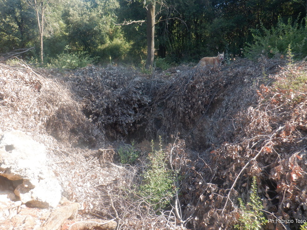 Il giro termina dopo una mezz’ora quando sbuchiamo in una zona disboscata di fresco, un’altra zona destinata a diventare un intrico inestricabile di rovi. Controllo sommariamente senza trovare altro che i probabili resti di un forno per la calce.