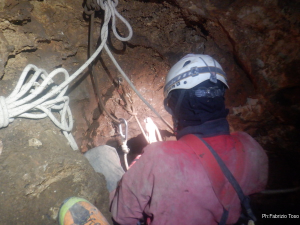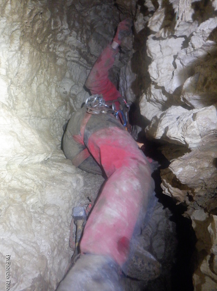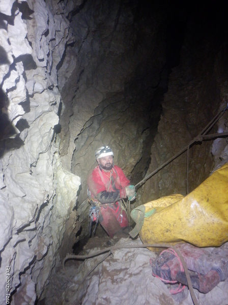 Breve pausa di riposo durante lo scavo. Io nel frattempo mi dedico a proseguire la risalita. Prendo quel che mi serve e parto. Sistemo la nuova corda che abbiamo portato sul doppio attacco che ho appena sistemato e poi mi sposto verso sinistra mettendo un nuovo fix. Noto che fatica non poco ad entrare nella roccia e la testa del fix si deforma parecchio, ma per ora non me ne preoccupo e proseguo.