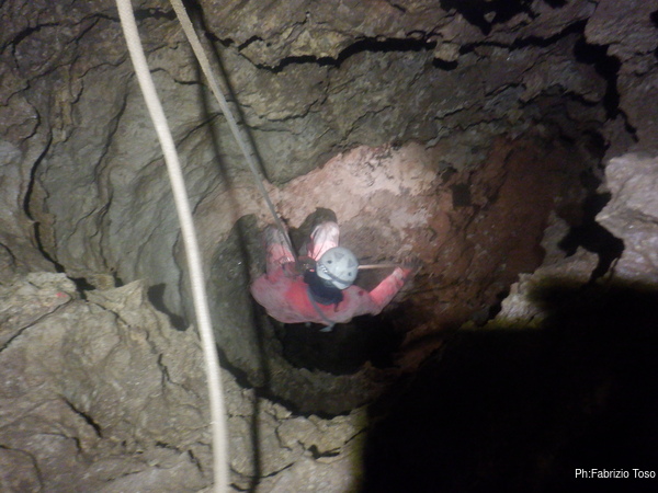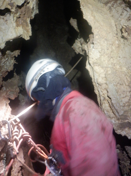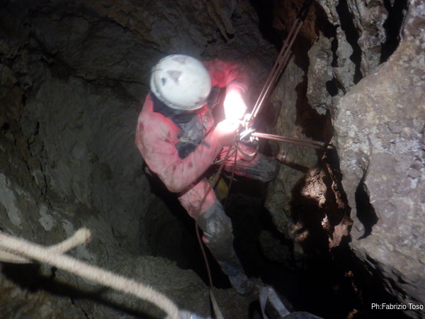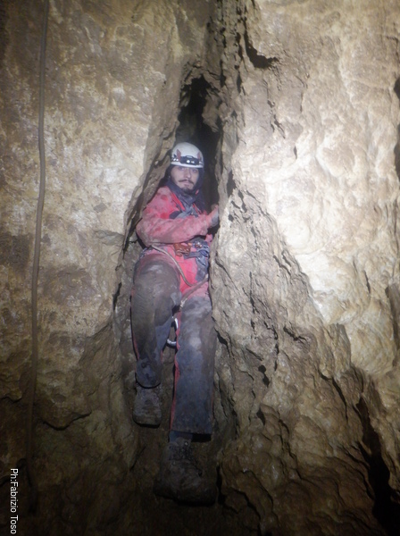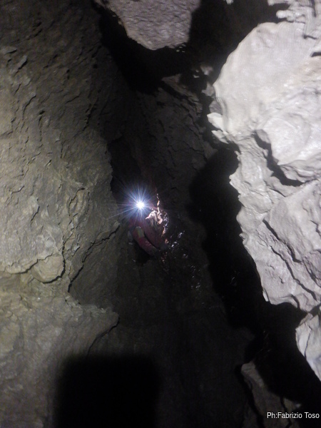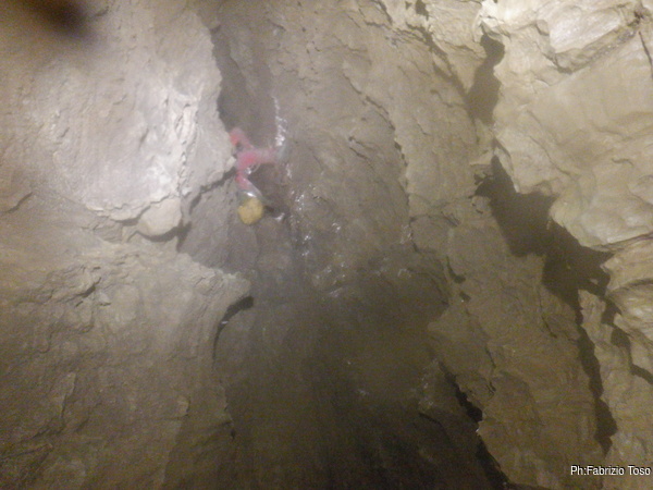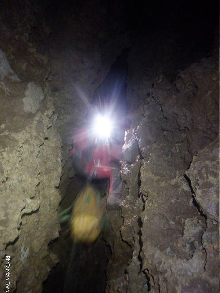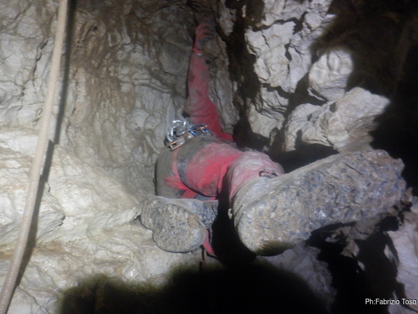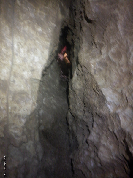 Pochi minuti e posso riprenderlo mentre affronta la strettoia di partenza del P25 (vedo dal rilievo che in realta’ e’ un P28 ma oramai l’ho in mente cosi’, speriamo la grotta non si offenda!).
