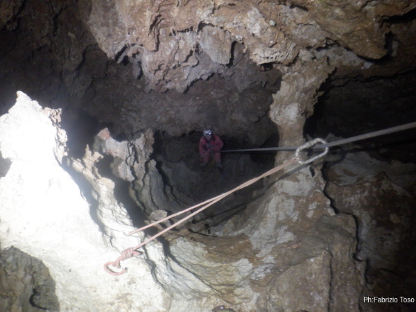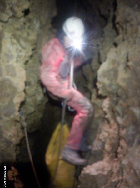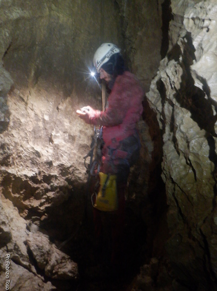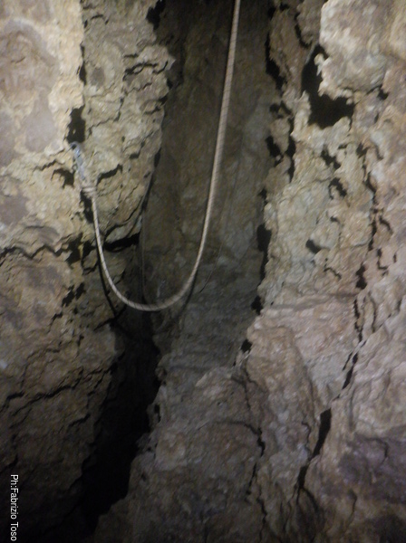 Nell’ultimo tratto del pozzo c’e’ solo una corda, quella dove sto scendendo io. Quella di Luca c’era ma e’ stata tagliata per poter fare una delle risalite, quella fatta con Elisa anni fa. Mando un saluto silenzioso a Elisa, impegnatissima col suo nuovo lavoro, mentre fotografo la corda della risalita alla base del P50.