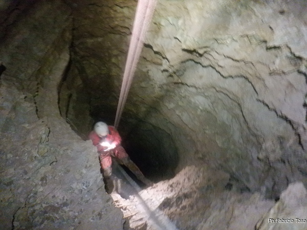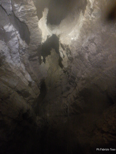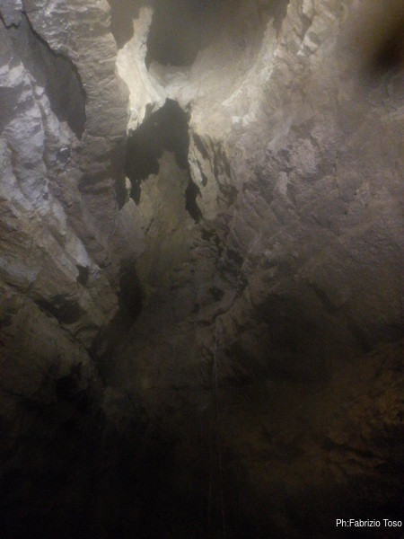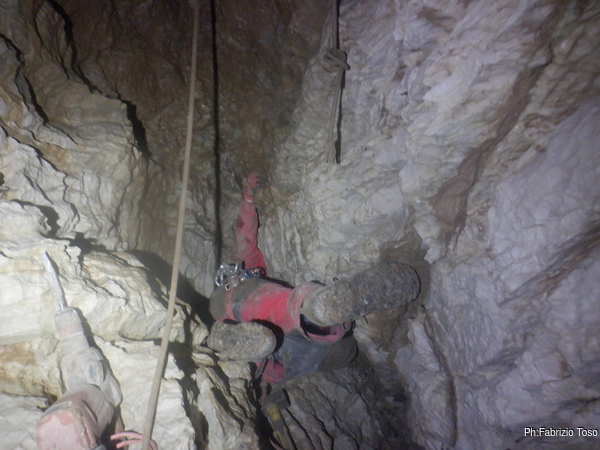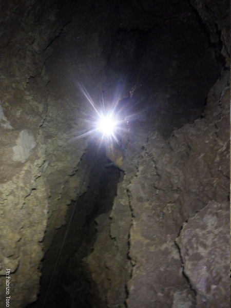Con l’aiuto della luce di Luca illuminiamo piu’ possibile il pozzo da risalire. E’ un bel pezzo da fare, ci vorra’ pazienza. Inizio a spostarmi lateralmente piantando altri fix, sempre piu’ a fatica. Penso sia colpa mia per non pulire a dovere i fori prima di metterci il fix dentro. Non mi fa sospettare nulla nemmeno il fatto che per ogni foro impiego un paio di minuti per completarlo.