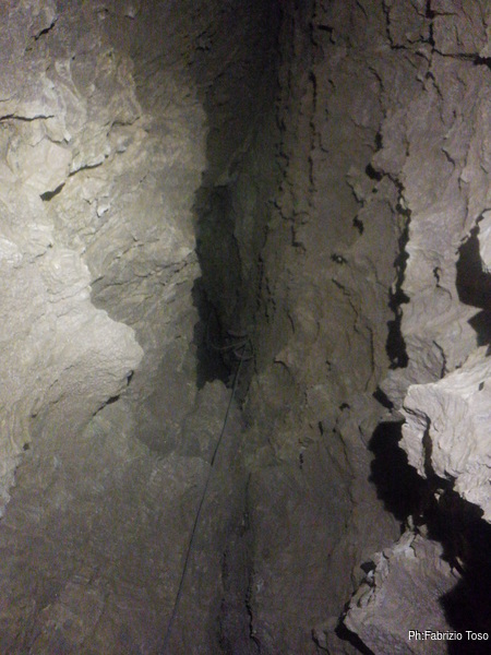 Risolto con il multifix impertinente, riprendo con l’armo. Ho fatto la cavolata di lasciar cadere la corda di risalita che ora pende sconsolata in corrispondenza del penultimo attacco messo. Per fortuna Luca viene in mio aiuto, sale, recupera la corda e me la tira.