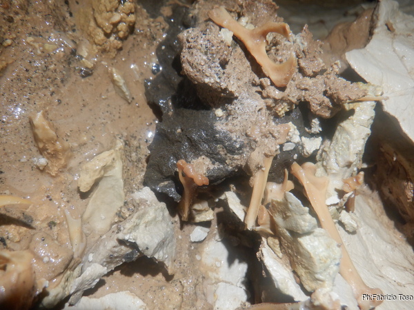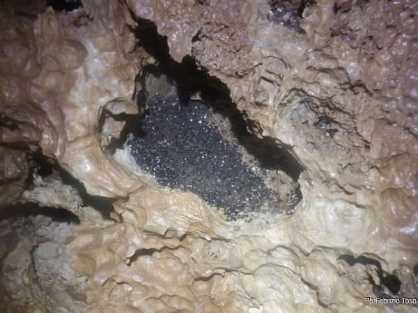 Il P50 inizio a salirlo io, al frazionamento urlo la libera cosi’ Luca puo’ salire. Come penso sempre, dobbiamo portare uno spezzone di corda per doppiare anche gli ultimi metri di pozzo. Un giorno lo faremo. Sopra al P50 mi fermo un attimo a riprendere fiato e aspettare Luca ma dopo nemmeno 5 minuti inizio a sentire freddo, faccio una foto ai sassolini neri che adornano la grotta, dicono essere i residui di una qualche attivita’ vulcanica di chissa’ quando.
