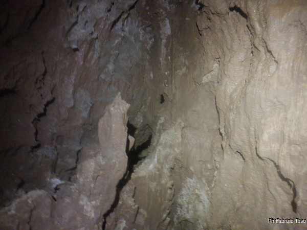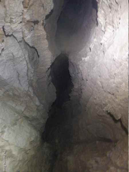 Mi guardo attorno. L’ambiente dove siamo ha una forma che possiamo immaginare come un occhio stretto e allungato in direzione NordEst-SudOvest. Il terrazzino e’ nella parte a NordEst. Quello che la volta scorsa mi era sembrata la partenza di un meandro da vicino si rivela la punta dell’occhio che chiude. C’e’ solo una possibile prosecuzione, sulla punta dell’occhio, in fondo al terrazzino. Mi ci avvicino, e’ un buco impraticabile ma interessante. Sento chiaramente arrivarmi aria in faccia. Lo lascio a Luca per un approfondimento.