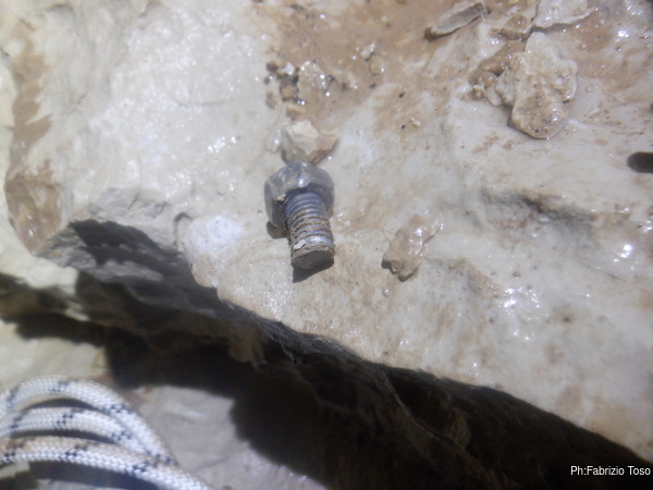 Dopo il mio tentativo di scavo lascio di nuovo il campo a Luca e vado a terminare con il recupero del materiale usato per la risalita e la sistemazione della corda. Provo a togliere l’ultimo attacco non piu’ utile ma nulla da fare, anche lui con la filettatura rovinata. Provo a svitare sforzando molto con la chiave, finche’ il fix incredibilmente si spezza. Rimango senza parole per qualche secondo poi documento facendo una foto al moncone di fix che mi e’ rimasto in mano, una cosa bruttissima da vedere. Pero’ almeno ho recuperato la piastrina!