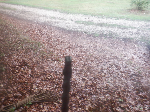 Alla fine del P25 urlo la libera a Luca che oramai sento sotto di me. Visto che tutto procede continuo a salire senza fretta fino ad arrivare all’uscita dove, con disappunto, trovo a d accogliermi la pioggia con un’aria calda e umida. Per fortuna la pioggia non e’ fortissima e poi i nostri amici sono gia’ qua di ritorno dalle loro passeggiate.
