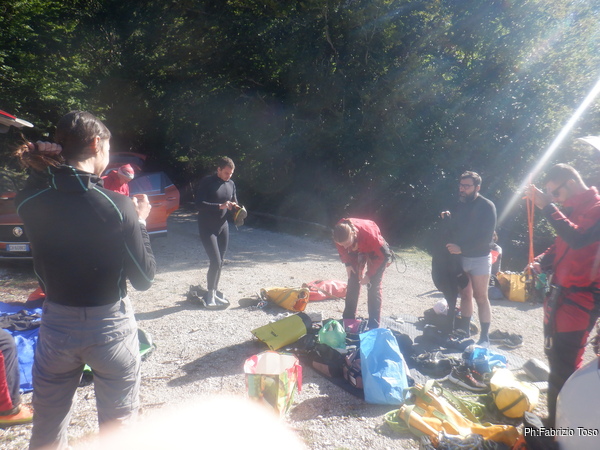Pochi minuti e siamo fuori, avvertiamo i nostri amici “risalitori” che abbiamo intenzione di iniziare ad uscire, loro concordano e iniziano a prepararsi per seguirci appena terminato un traverso. Il tempo di rifocillarci un poco e partiamo.