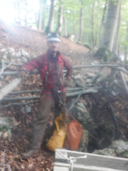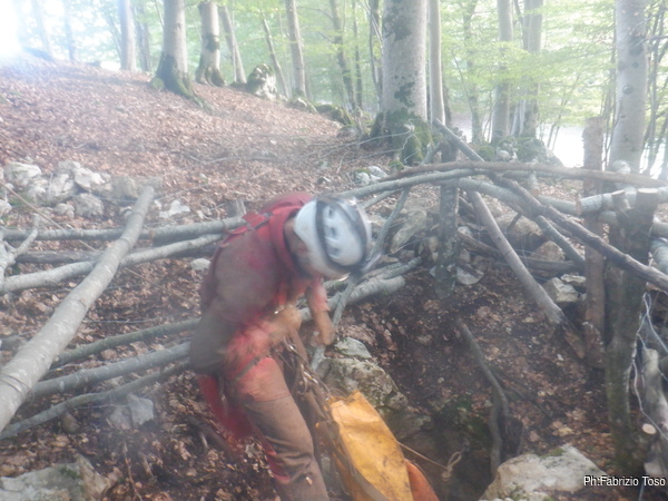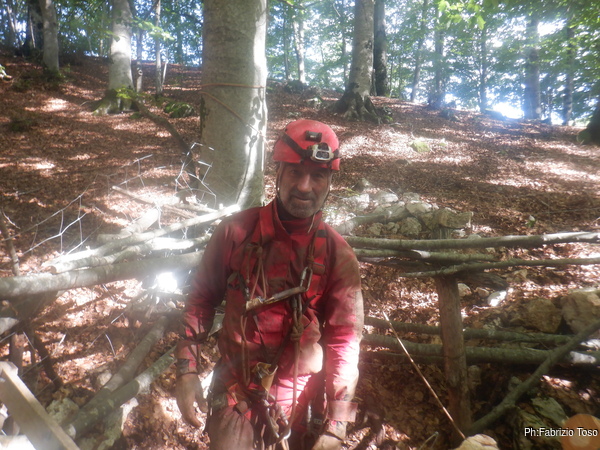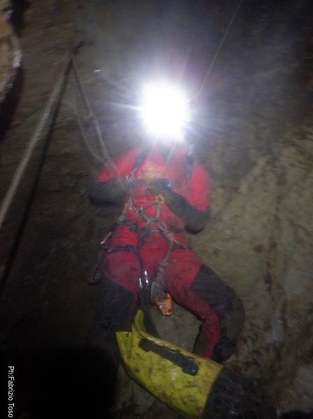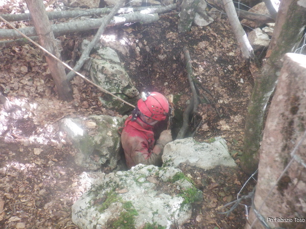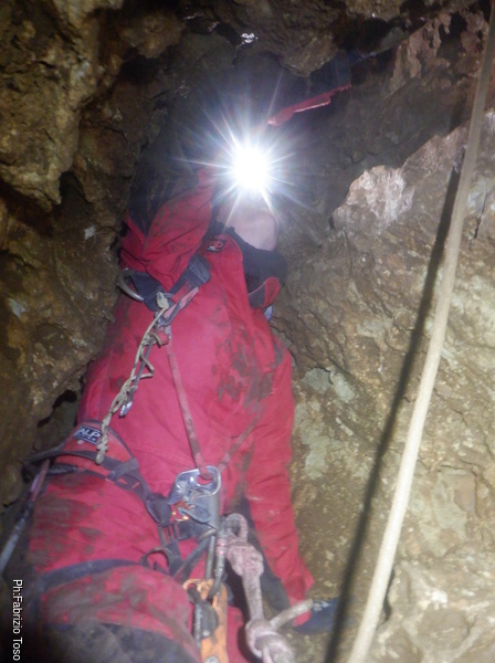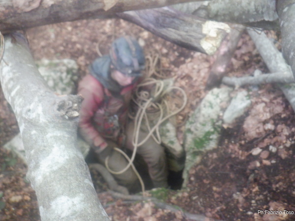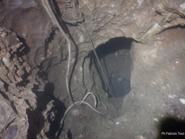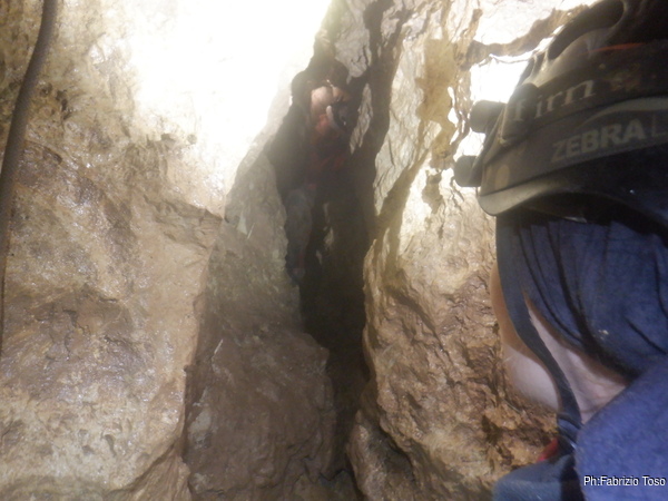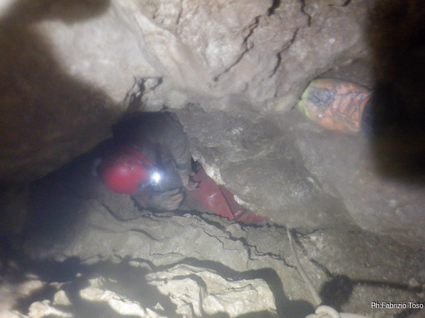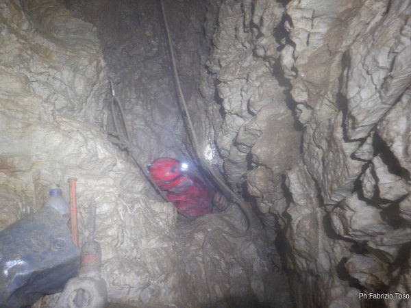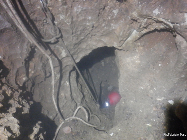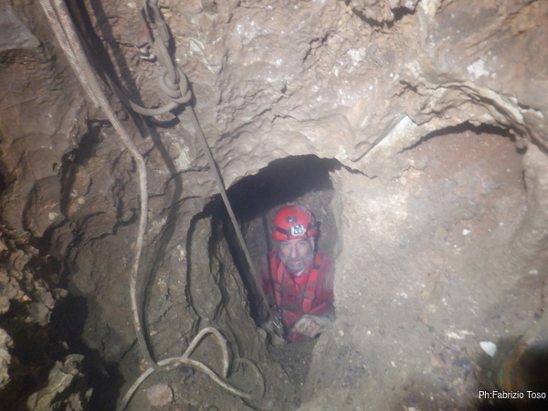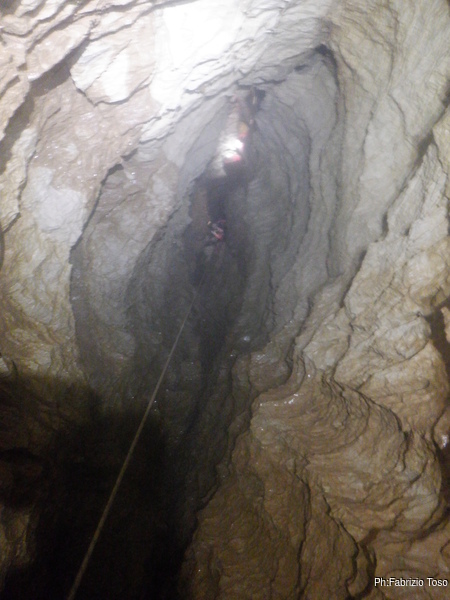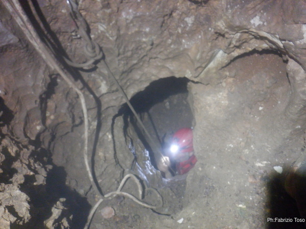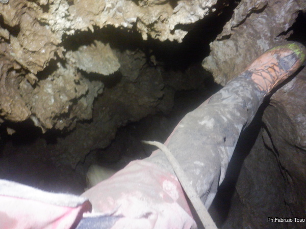 Scendiamo il pozzo. Con tutto il materiale non e’ impresa da poco, ma con pazienza e qualche imprecazione sia Giuliano che io riusciamo a passare. In verita’ devo dire che Giuliano non si lascia mai andare, fa quel che deve senza mai lamentarsi e sbuffare come invece faccio io, un compare molto efficiente!