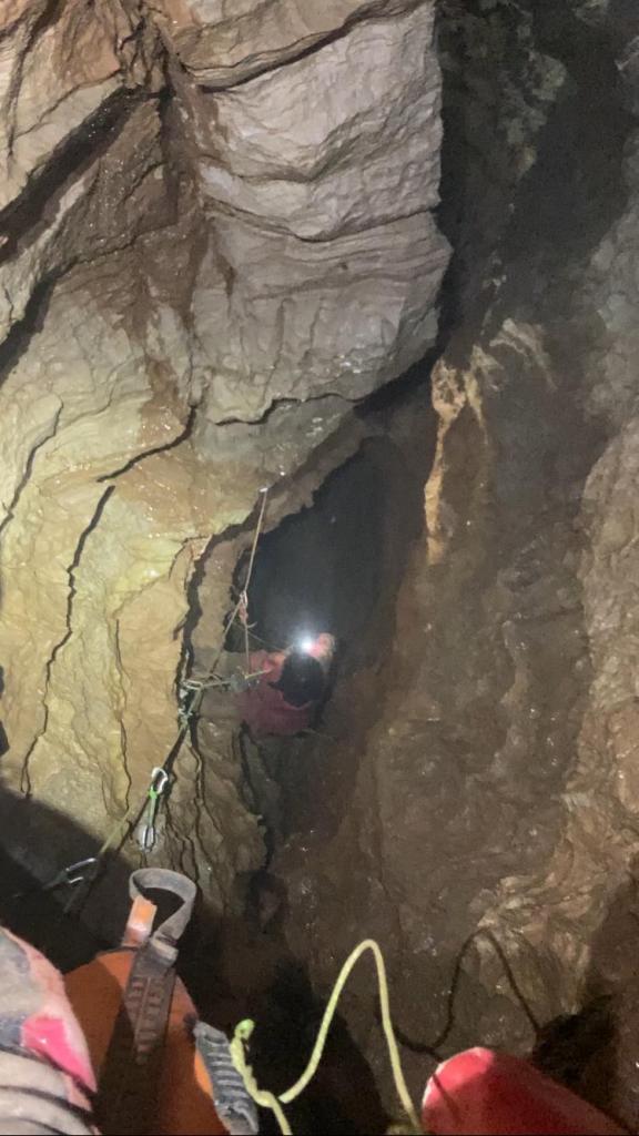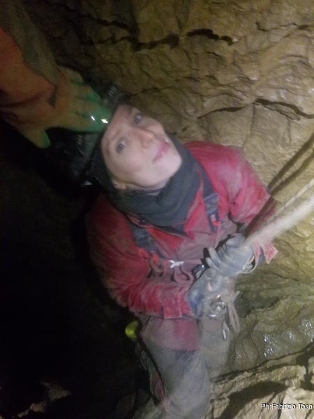 Mentre Linda stava attrezzando il traverso li abbiamo visti tornare su, erano soddisfatti del lavoro svolto e infreddoliti dall’aria che tirava laggiù, e avevano quindi deciso di iniziare ad avviarsi verso l’uscita. Intanto Linda si era affacciata dall’altra parte, scorgendo un piccolo passaggio sotto una lastra di roccia, dice di voler tornare per finire la risalita e scoprire se porta da qualche parte.
