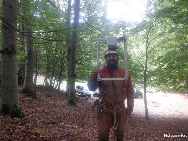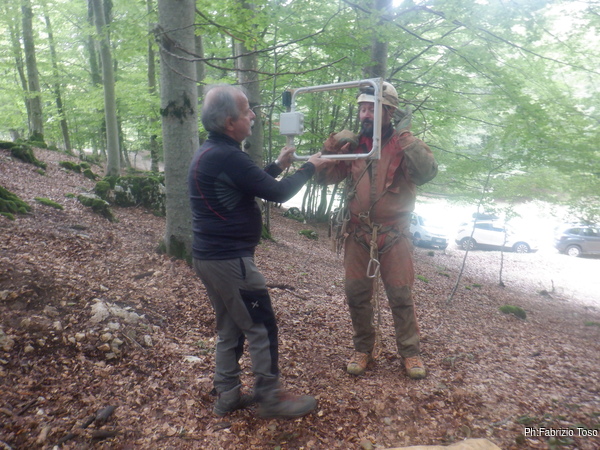 Ora passiamo a strumenti piu’ scientifici, Gabriele mostra l’emittente di segnale che io portero’ in grotta.