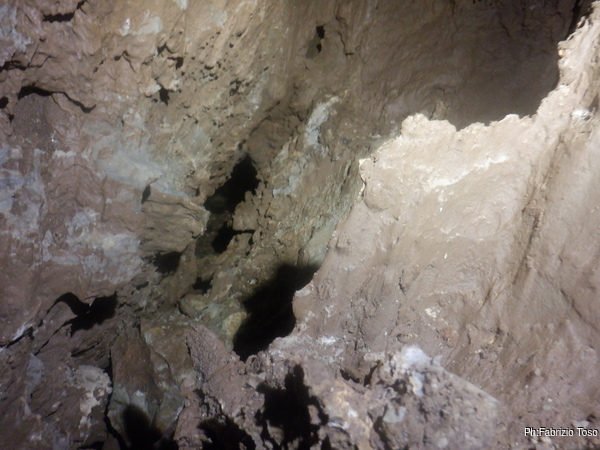Ancora un tratto di salita e sono al nostro “campo base” dove da un lato prosegue la risalita mentre dall’altra inizia il pozzo nuovo che stiamo allargando.