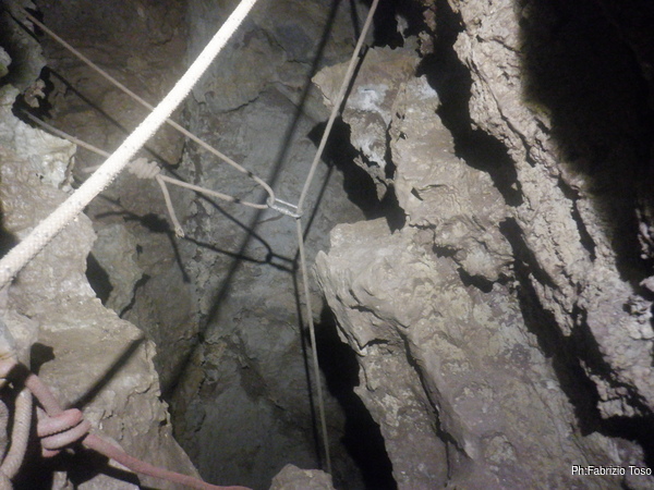 Affacciandomi sul pozzo vedo un attacco alla parete opposta, non lo ricordavo ma sembra proprio fare al caso mio. Mi preparo della corda, un moschettone e vado a verificare lo stato della corda rossa scendendo sulla bianca. La controllo per un buon paio di metri e per fortuna sembra essere integra, nemmeno la calza esterna sembra usurata. Bene. Mi sistemo piu’ comodo possibile e metto in opera il nuovo deviatore. Lascio che la corda rossa sia deviata di pochissimo dalla verticale, il deviatore serve solo ad evitare spostamenti accidentali quando qualcuno esce dal pozzo dopo averlo risalito.