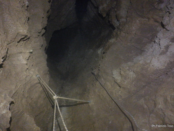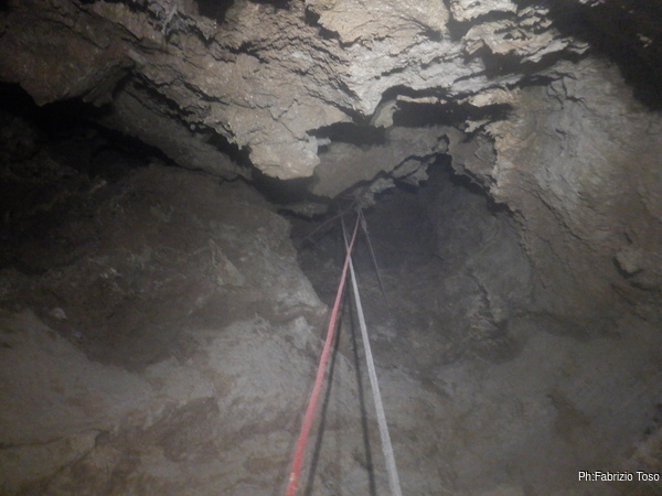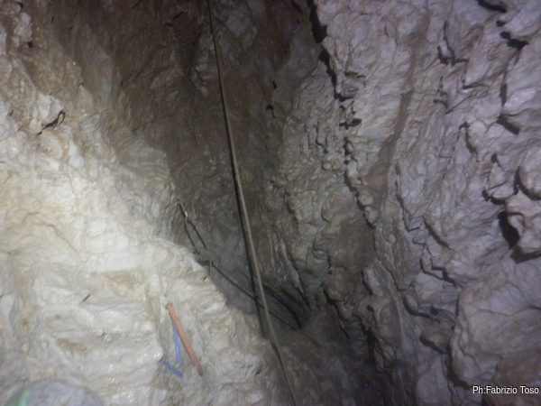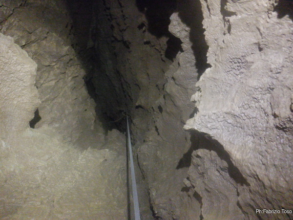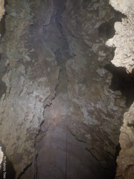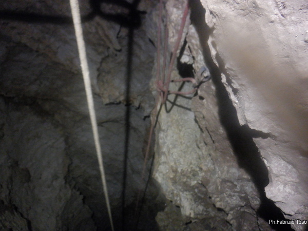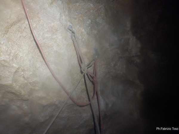 Impiego qualche minuto per attrezzare un attacco doppio da cui si potra’ ripartire la prossima volta poi mi dedico alla fotografia per cercare di carpire in anticipo i segreti che la grotta ancora cerca di nascondere. Il gioco di luci e ombre che si vede in alto e’ affascinante e riempie di curiosita’, ma per oggi non ci sara’ modo di andare oltre. Concludo con un nuovo tentativo via radio ma senza successo.