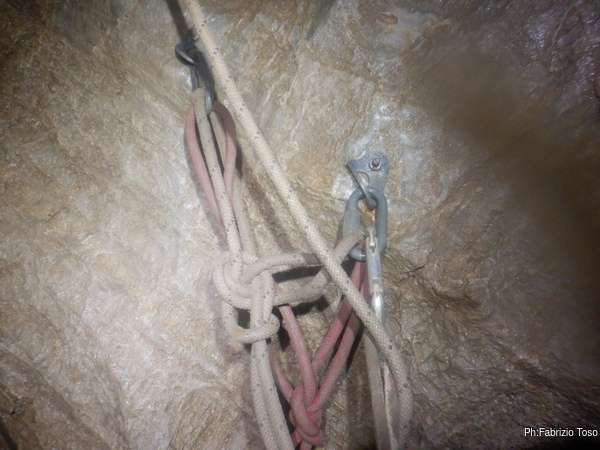 Al frazionamento di meta’ pozzo mi fermo di nuovo per sistemare una situazione anomala. La corda bianca, che al momento e’ l’unica ad arrivare fino in fondo al pozzo e’ su uno solo degli attacchi, quello piu’ in alto sulla sinistra. La corda rossa, che dopo pochi metri ha un altro frazionamento utilizza invece entrambi gli attacchi. Visto che sono in vena, sistemo questa stortura. Con un po’ di fatica e qualche mala parola nei confronti delle maglie rapide che non si vogliono aprire, sfilo la corda bianca, rifaccio il nodo e lo sistemo sugli attacchi. Dato l’intrico di corde in gioco non faccio un ottimo lavoro ma decido che lo sistemero’ poi al ritorno. Gia’ comunque e’ meglio di prima. Proseguo la discesa.