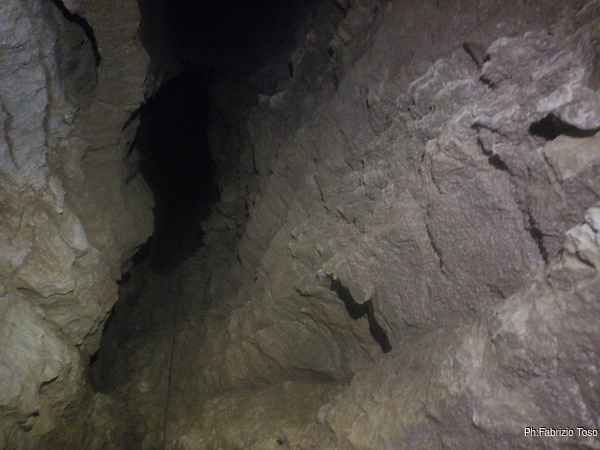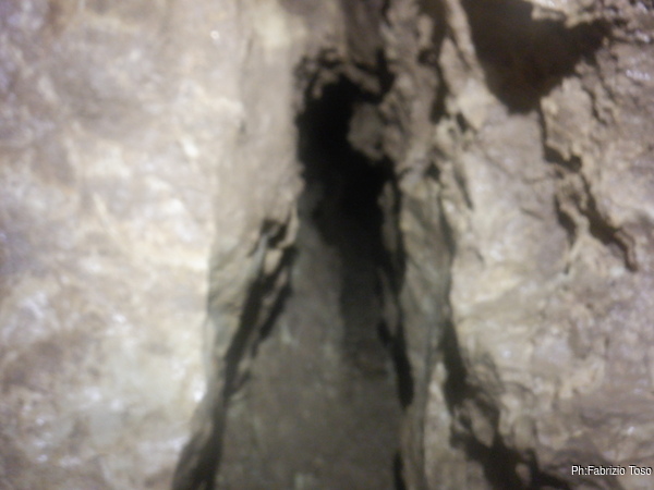 Al passaggio stretto ma non troppo che porta al camino che stiamo risalendo, riesco finalmente a togliere qualche decina di sassi in bilico, finora l’ho detto a tutti coloro che sono passati per ultimi ma senza esito. Oggi che sono sia primo che ultimo posso finalmente farlo e togliermi il pensiero. Quando finisco sono talmente soddisfatto che dedico una foto al punto che ho ripulito.