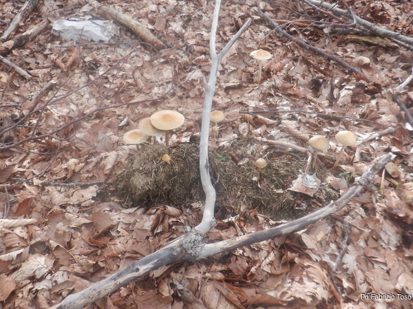 Il bosco e’ disseminato di queste allegre famigliole di funghi. Ne fotografo alcuni mentre ci aggiriamo cercando la grotta.