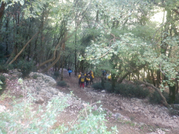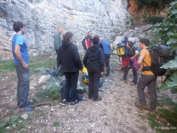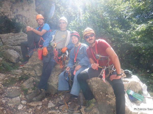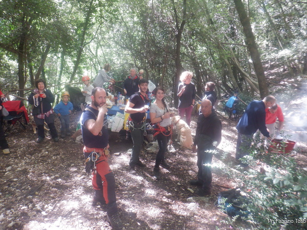 Qualche minuto per sistemare i materiali che useremo poi parto per sistemare il traverso che colleghera’ tutte le vie. Fabio abbandona anche lui la grotta e mi segue per dare una mano. Sopra di noi abbiamo anche Luisa, Pierleonida e Flaminia che fanno il tifo.
