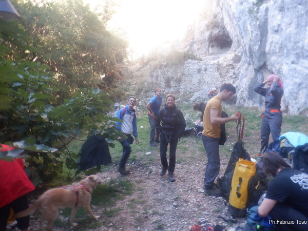 Insieme al nostro gruppone sembra siano arrivati anche alcuni arrampicatori. Speriamo che anche oggi si riesca a passare la giornata in tranquilla condivisione degli spazi in parete.