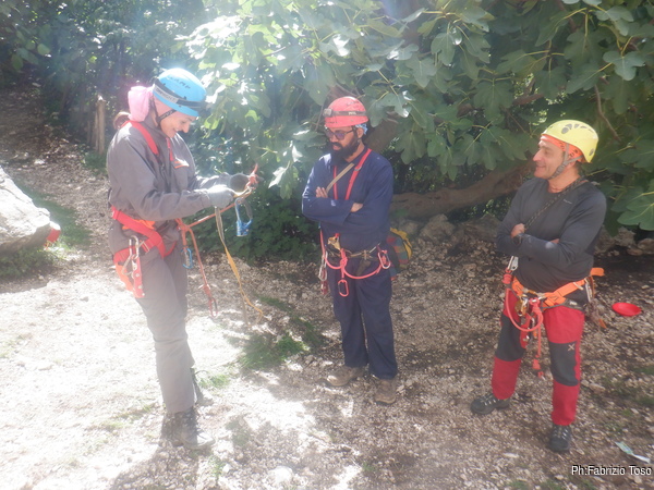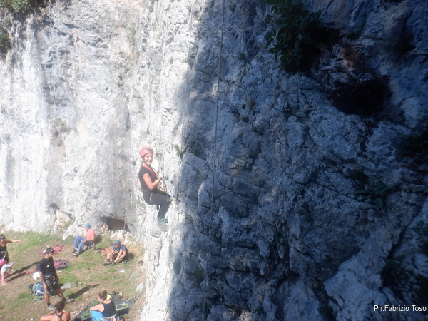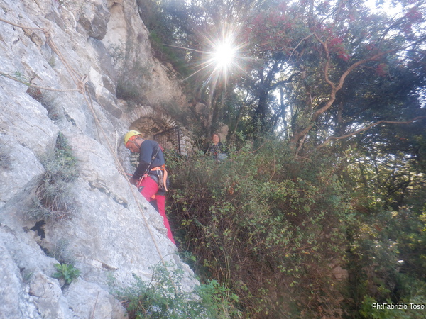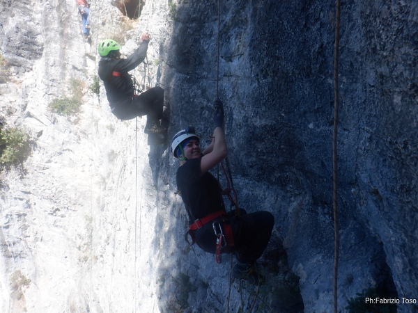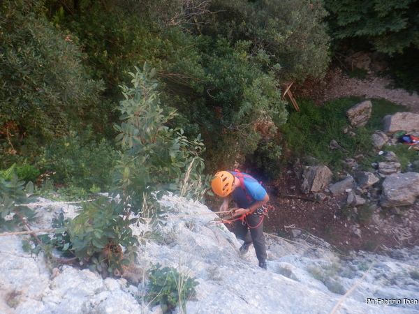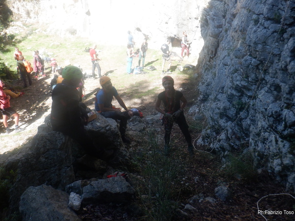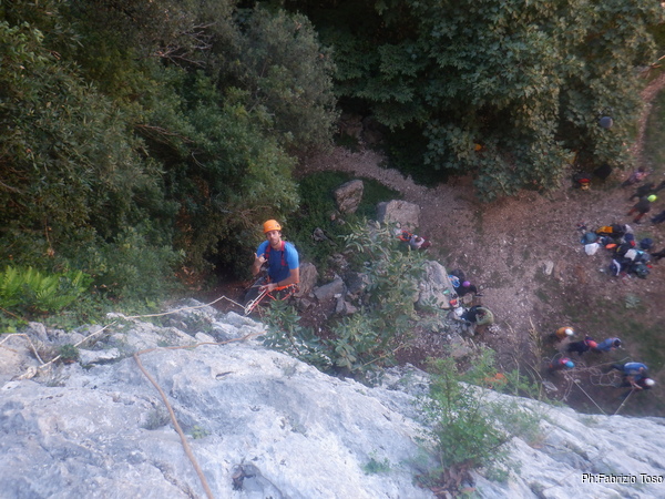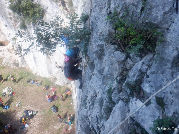 Massimiliano prende in mano la situazione e inizia a organizzare le attivita’ necessarie. Io sono gia’ imbragato quindi mi tocca, e non mi dispiace di certo, andare ad armare le vie dove ci eserciteremo.