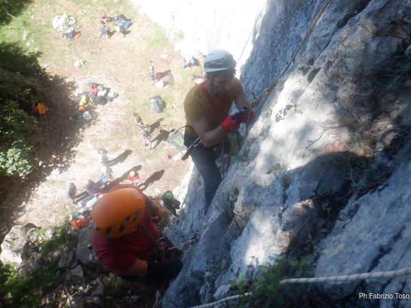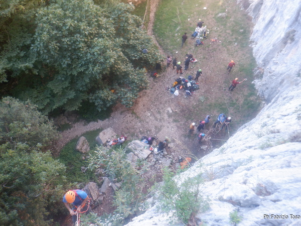 Vedo che sotto di me il prato antistante la parete si e’ animato. Mi tranquillizza vedere che gli allievi hanno terminato la vestizione e completato le laboriose regolazioni dell’imbrago e della attrezzature. Ora sono alle prese con le prove “basiche” con le attrezzature, ovvero il loro montaggio sulla corda ed esempi pratici sul loro utilizzo.