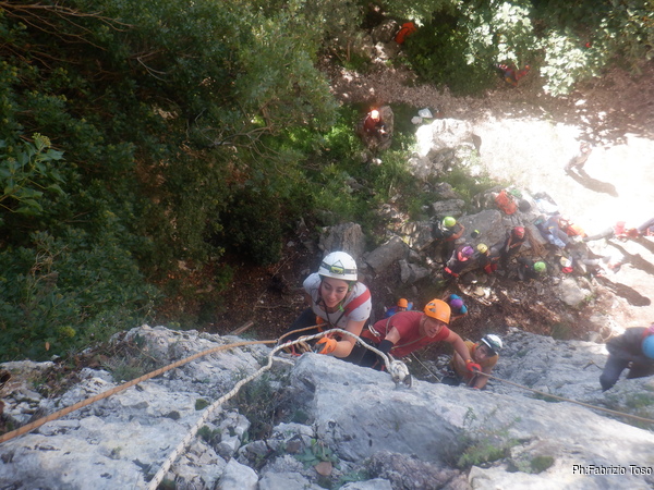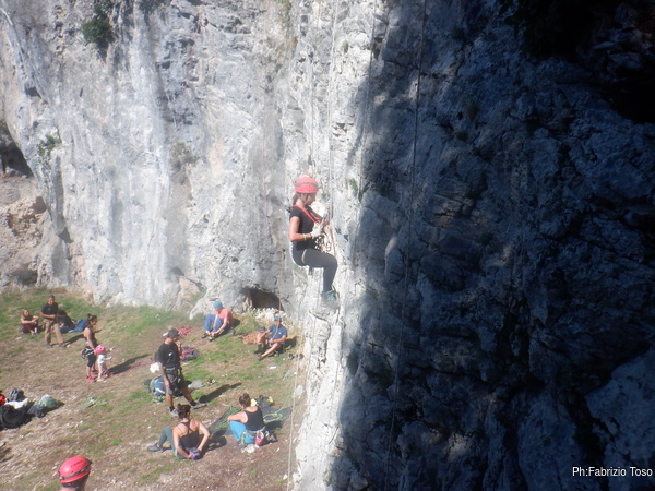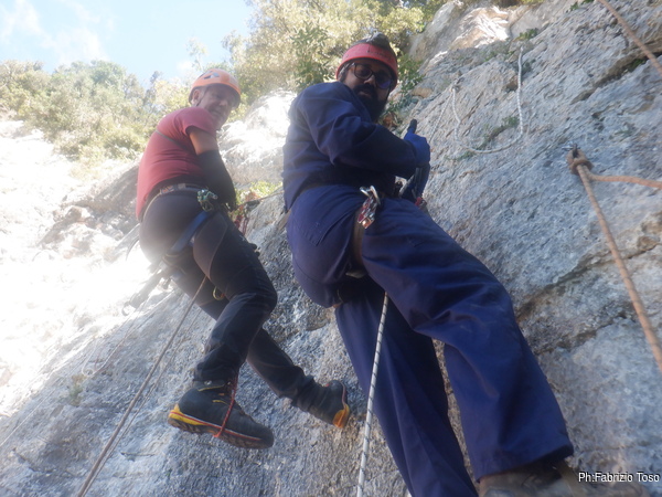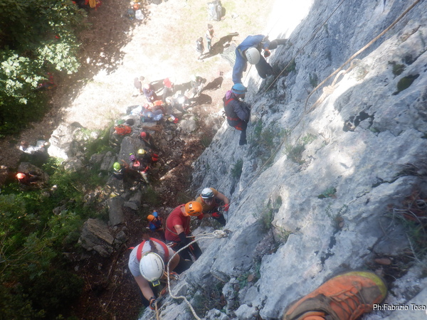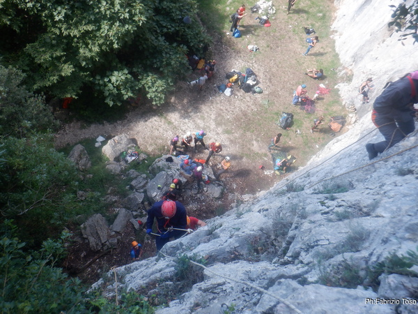 Fabio arriva a terra, il suo lavoro e’ terminato, io sono ancora a meta’ traverso. I primi istruttori iniziano a fare una salita di prova. Sale prima Fabio e poi Netta. C’e un piccolo problema su un tratto di corda che struscia sulla roccia. Probabilmente si dovra’ fare qualche cambiamento. Quando arriva Fabio guardo di nuovo verso la grotta e ne approfitto per salutare Maria, non sapevo venisse anche lei ma ne son contento.