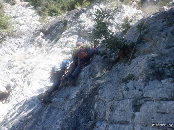 L’armo del traverso prende piu’ tempo di quanto credessi. Cedo allora alcuni attacchi a Fabio che con la seconda corda inizia ad armare la prima via per i nostri alllievi.