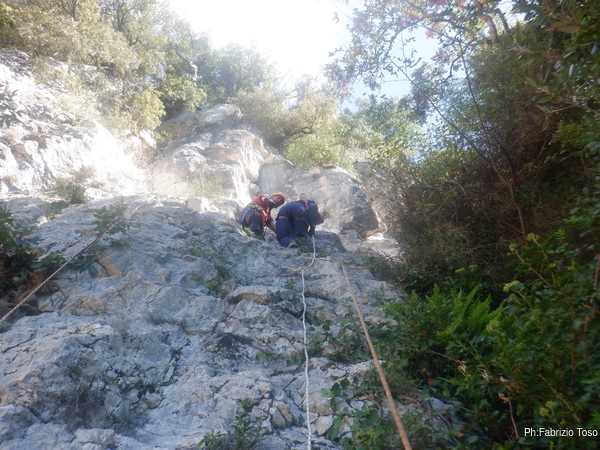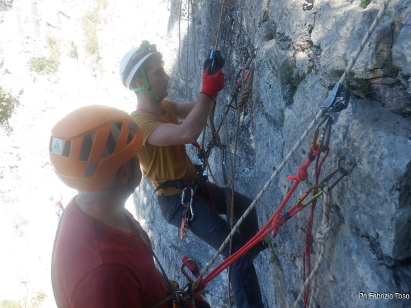 Termino di armare il traverso e Fabio mi raggiunge nuovamente su con un’altra corda da sistemare per i nostri allievi. E’ una corda da 40m, proviamo a utilizzarla per armare ben 2 vie. Purtroppo poi ci accorgeremo che siamo stati troppo ottimisti e dovremo inventarci soluzioni alternative e fantasiose giunzioni per terminare il lavoro.