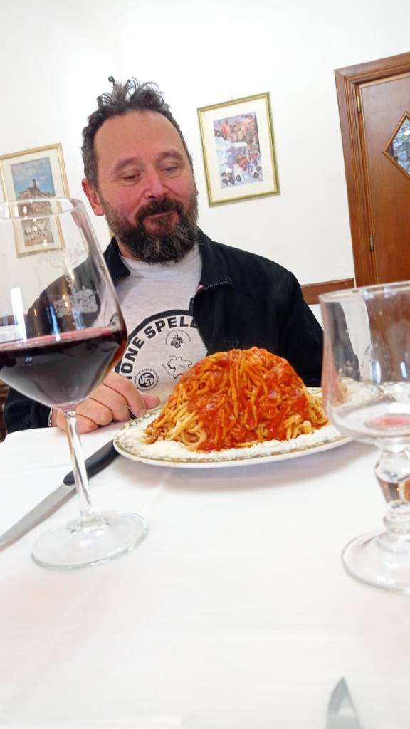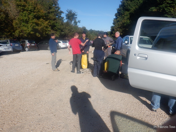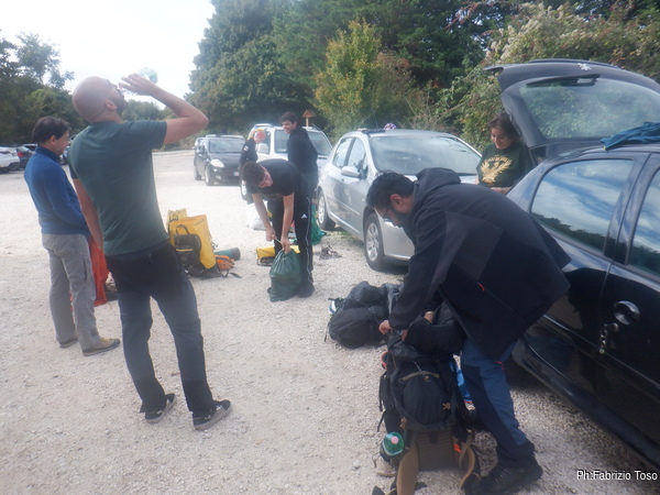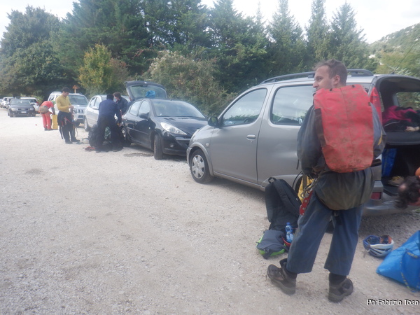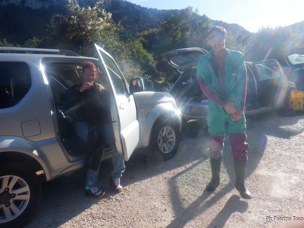 Alle auto ci cambiamo e rimettiamo a posto i materiali negli zaini. Max intanto contatta i nostri amici de “la Sbirra” il nostro ristorante di riferimento quando siamo da queste parti.